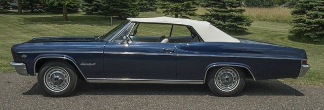 1966 Chevrolet Impala convertible with SS equipmentRepainted original color ofadmiralty blue with new white convertible top and new white interior Factory air supplemented with vintage air.Tilt wheelNew coker bias belted tiresAM FM radioStainless steel dual exhaustUnderbody cleanFactorygauge packageBoth side rear view mirrors |