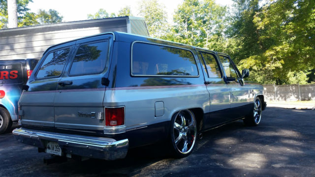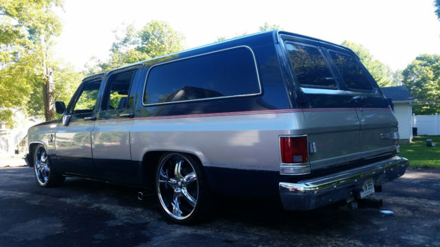 FOR SALE IS MY 1985 CHEVY SUBURBAN 1500 SILVERADO EDITION 2WD WITH A V8 5.7L ENGINE AND 3RD ROW SEATING. BODY MODS : ALL STOCK EXCEPT FOR AFTERMARKET HOOD AND GRILLE SUSPENSION : BELLTECH 5"/7" DROP KIT INTERIOR : 100% STOCK DOWN TO THE ORIGINAL 2 KNOB RADIO WHEELS : 22" BOSS RIMS ENGINE : 100% STOCK 5.7L V8 OTHER THEN A CHROME DRESS UP KIT AND TRUE DULL FLOW MASTER EXHAUST SYSTEM. THE BAD : HEATER CORE LEAKS BUT I HAVE A BRAND NEW ONE SITTING ON THE FRONT SEAT AND THE A/C COMP LOCKED UP SO IT WAS BYPASSED OUTSIDE OF THAT THE TRUCK RUNS AND DRIVES GREAT IM ONLY SELLING IT BECAUSE IM TRYING TO OPEN A RESTAURANT. I HAVE VIDEO OF THE TRUCK BUT I CANT FIG. OUT HOW TO ADD IT TO THE LISTING SO IF YOU TEXT OR IN BOX ME I WILL SEND YOU THE VIDEO. 203-650-1072 JAY |
