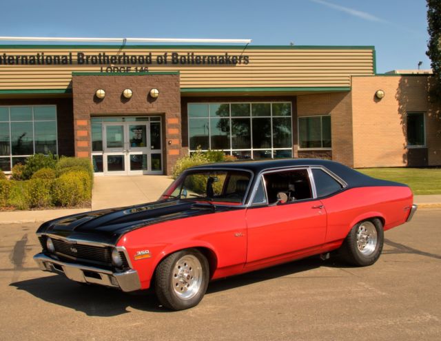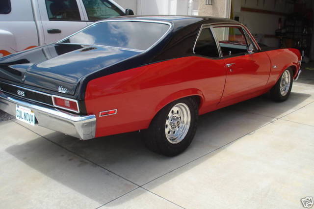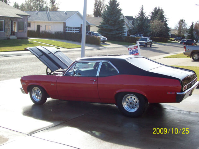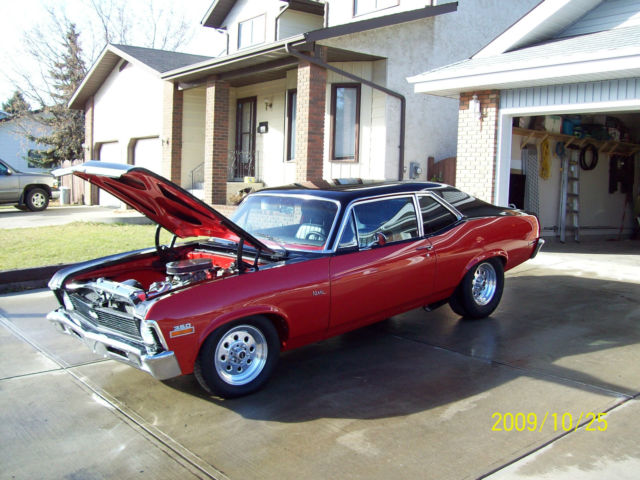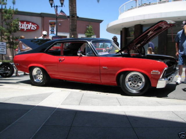 This street machine is back from a very thorough frame off restoration. One of the cleanest Novas on the street. Built by one of southern California's hot rod shops located in Temecula, A-The Hot Rod Hut. Interior -new dash pad, ovans's classic gauge cluster, utometer Sport Comp II gauges, urst quarter stick shifter, CAT pro leather bucket seats, eadliner, oor panels, ear seat and cover, arpet, nd Dyna mat complete interior Stereo-If you like stereos that have kick, his one has it!! -Alpine CD head unit, nfinity 6.5" seperates in new front kick panels, enwood 4-way 6x9 rear speakers, L Audio W6 12" subwoofer, ockford Fosgate 4 channel amp for highs and mid, ockford Fosgate 2 channel amp for subwoofer, .4 Farad cap, ptima battery Engine & Trans Old School Thumper Cam Sounds Great!! -rebuilt 350 CID small block Chevy Dynoed at 408HP, 0:1 pistons, V Melling oil pump, qt chrome oil pan, eiland water pump, el-Pro gaskets, omp cams 280H cam, omp Cams lifters, omp Cam valve springs, etainers & valve seals, .5 roller-tip rockers, ir gap intake manifold, olley 750 carb, ir gap intake manifold, SD distributor and ignition wires, OUGS full length headers, lowmaster3"mandrel bent dual exhaust, ew alternator and power steer pump, ully built TH350 with B&M cooler FULL MANUAL, &M 2400 RPM stall converter, .73:1 gears in cooperate 10 bolt, ith Easton POSI, raction bars Exterior -the exterior was custom painted by the Leo Martinez known as the Godfather of the Inland Empire Hot Rod. It is a 2 tone black on red. The car had minimal rust through out and was meticulously prepped for 7 coats of paint. The car was prepped and painted on a rotisserie so that not a single angle was over-looked. The bottom and interior are prepared with sound-deadening undercoating that is color matched to the exterior. The sub-frame and axle were removed and powder-coated along with sub-frame connectors, ore support, nd hood hinges. Along with a Goodmark 2 3/4" steel cowl induction hood. All the window mouldings and run channels are new, s well as door and trunk seals. The grill, eadlight bezels, nd fender trim is great condition as well. After powder coating, he suspension was completely rebuilt with Hotchkis rear leaf-springs and all brand new MOOG parts in the front suspension. Weld Wheels at all four corner, ld school pizza cutter wheels and tires in front. Lowered 2" SS badges were added, ot a true SS car! All in all this is a completely rebuilt car from the ground up, o nut or bolt was overlooked. There is over $40,000 invested in this rebuild!! You must see, rive and hear this car, OW!!! Any questions, lease email at skipweeks4010@shaw.ca and we can discuss personally if chosen |