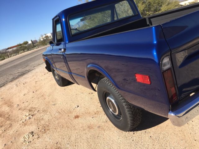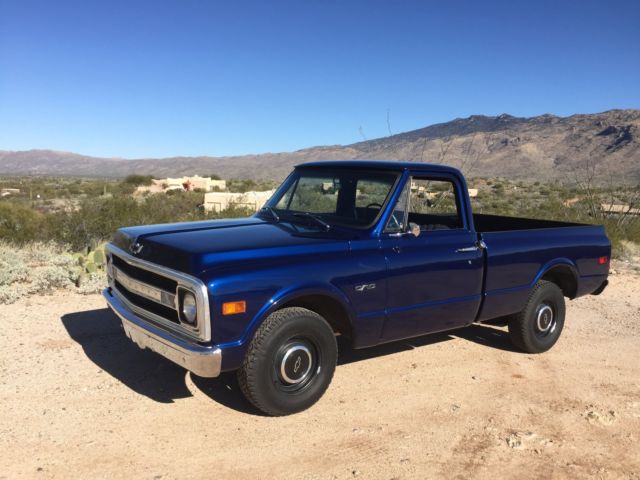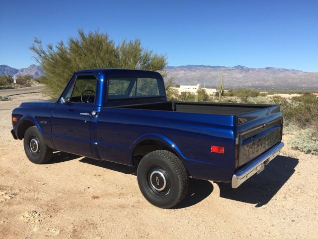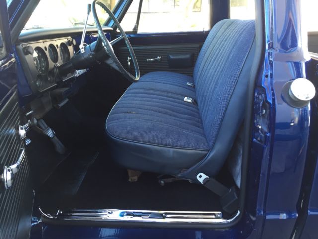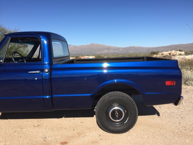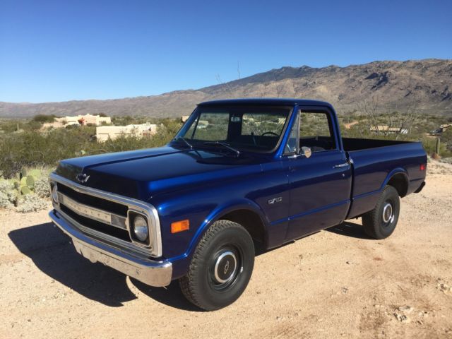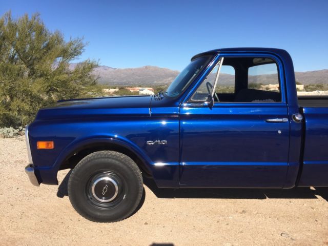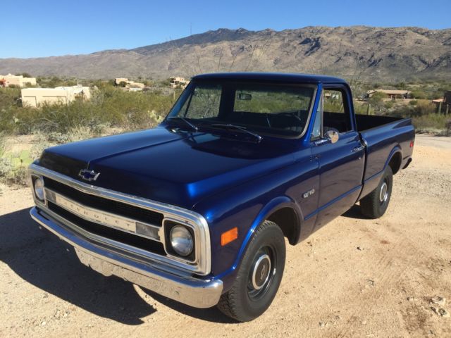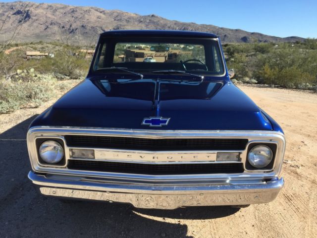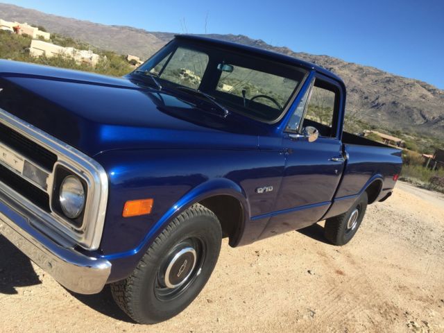 Up for auction is my 1970 C-10 Short bed factory big rear window. Has been in the family since new. Original short bed since new!! It is daily driven and very dependable. Summit Crate 350 engine. Runs amazing and never hot! Edelbrock aluminum intake with Edelbrock 650 carb and electric choke. Turbo 350 tranny. Hooker headers with dual flow master exhaust. Interior is nice and clean. Has new carpet, ash pad, ome light, oor rubbers, nd door sill plates. Seat is in good shape has one small tear. All gauges work as they should. All exterior lighting works as it should including high beams and turn signals. Exterior is nice and straight. Paint is Luxo blue and shows very well. Inside of bed is nice and not beat up. Paint is about one year old. New rear smoothie bumper. New front windshield and seal. New wiper arms and blades. New bow tie for hood, ew bow tie side mirror, ew side markers and tail lights. Clean and clear Arizona title. This is a very nice truck that gets lots of looks where ever I take it. Front end was recently rebuilt with upper and lower ball joints, ew tie rods, itman and idler arm, ontrol arm shafts and bushings. This truck has never been lowered or had the suspension modified. Also included is factory radio, ew armrests in black, nd ashtray. Would not hesitate to drive anywhere!! Please call for any questions 1-520-548-6158. Good luck bidding!