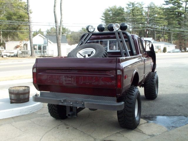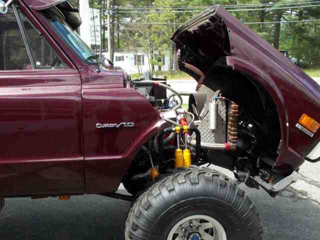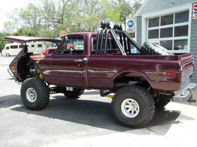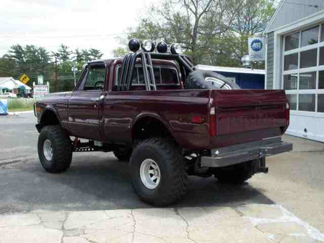 1972 Chevrolet K-10 4x4 pickup : 383 cid / 350 bored .030. over with 400 cid crank and rods . Holly 4 bbl. carb, delbrock Performer manifold with NOS. Aluma coat headers / dual ex. Mallory electronic ign. After oil and trans coolers. Russell braided steel lines thru out . Detroit Locker rear / Tru-trac front. Rebuilt Turbo 350 trans Suspension is 8 inch Superlift / 4inch body lift. Triple shocks fron, dual shocks rear Dual steering shock, Front and rear Rhino skid plates . Custom tilt nose / custom battery boxes . Smittybilt triple / double rollbar .(8) Hella off road lights. (5) 15x10 alumni. Rocket wheels .(5) 38x15.50/15Lt Ground Hawg radials. Baja style spare mount. Interior is custom button and tucked. I bought this truck June 197, e did a frame off resto in 1981/82 . It has been garaged in a climate controlled shop since . Thanks for looking Dave.