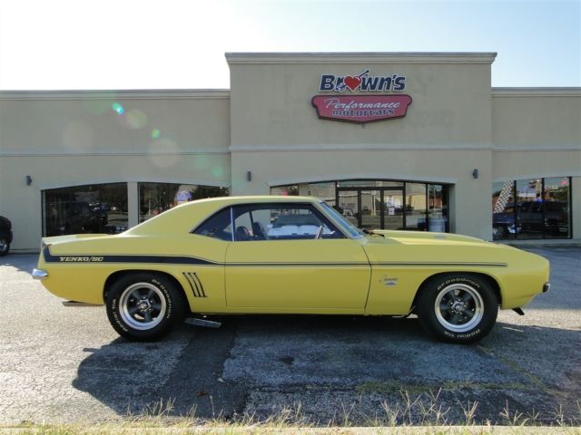 This is one beautiful 69 Camaro Yenko Tribute that has gone through a frame off restoration. The underside looks amazing and dressed up in chrome. Covered in the correct yellow paint that is in excellent condition. All of the chrome is in great shape, s well as all of the Yenko badging. This Camaro has shaved door handles to give it that smooth look. This car wears nice American Racing wheels with fresh BF Goodrich rubber. The interior is in excellent shape, quipped with the correct Yenko bucket seats, utoMeter gauge cluster, urst quarterstick shifter, nd a Rev Safe rev limiter. This Yenko runs and drives great! a 427ci big block with a Holley 4 bbl carb and Hooker Competition headers, acked by a TH400 auto trans, 2 bolt rear with 3.73 gears. This car not only runs, ut stops at ease with front disc brakes. Yenko Camaros are hard to find, o don't miss your chance to own an amazing clone. Questions about our vehicles Contact Our Staff at Brown's Performance Motor Cars 410-553-6211 Only Tax, ags and Processing not included. 410-553-6211 Only Tags, axes and Processing Fee additional to Brown's Price
