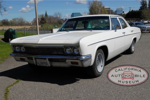 Offered for Sale by the California Automobile Museum Great Driving 1966 Chevrolet Bel Air Sedan We Offer Financing Please inquire before bidding Exterior Repainted white paint is in good shape with only a few chips present. Drivers side door lower corner does show minor rust and bubbling in the paint, passenger door has a few specks of red paint, likely from another project. No other damage found to glass, chrome or trim. Interior Reupholstered interior was well done and only shows minor wear on the drivers side front. Rear deck cover is starting to pull up at the top of the rear seat. Mechanical Straight six engine starts easily and runs well. Automatic transmission shifts smoothly. Car has no trouble driving at and maintaining highway speeds. Power steering and upgraded power front disc brakes also work well. All gauges with the exception of the fuel gauge appear to be working as they should, radio is not functioning. AC controls are present under dash but compressor and mount has been removed. |