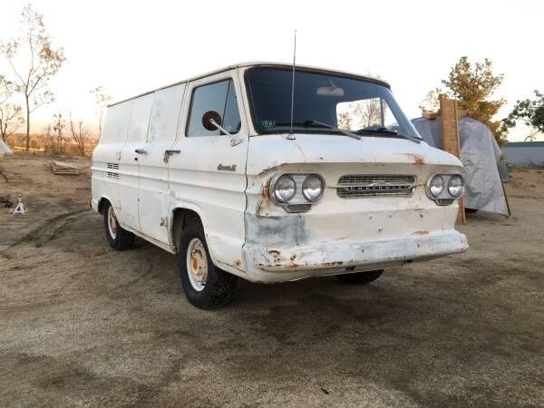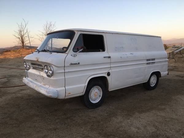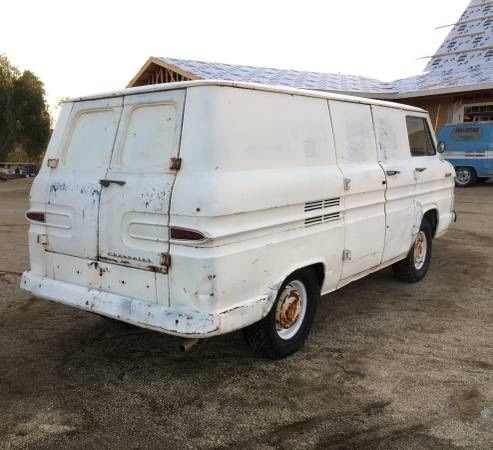 NO RESERVE I have an original condition 1962 Corvair panel van. Very dry van. No frame rot whatsoever. It's all complete. All lights work except turn signals, even dash lights and interior dome light. Currently registered. Brakes redone, tank pulled and cleaned and coated. Has 3 speed on the floor, shifts fine. No windows. VERY RARE back doors on it with no windows. I have doors white doors with Windows if you'd like them instead. Engine starts but leaks heavily, needs some work. Carbs are freshly rebuilt. I have receipts for the brake job, carbs, and tank cleaning. Racks not for sale.