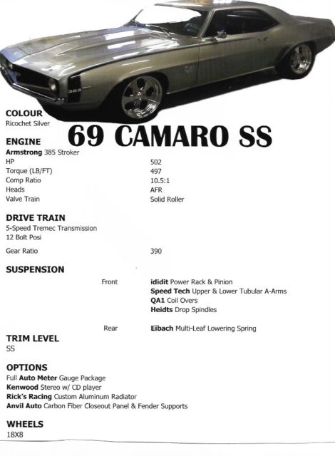 Decided to sell our 69 Camaro SS Pro touring The engine is a 383 Stroker motor the was professionally built at a reputable speed shop, It has 502hp and 497pds of torgue.. Comp Ratio is 10:5:1.. The heads are aluminum AFR and finally the valve train is solid roller . The drive train is a 5 sp Tremec back to a 12 bolt with 390 gear ratio. Front suspension on the front is a ididit-Power Rack@ Pinion, SpeedTech Upper @lower Tubular A-Arms. QA1-Coil Overs with Heidts Drop Spindles.. The rear end has the Eibach Multi-Leaf Lowering Springs. 'Trip level" is SS Other options Full Auto Meter Gauge Package, Kenword Stereo w/CD player and usb port The Camaro also has the Ricks Racing Custom Aluminum Radiator with carbon fiber closeout panel and supports.. Eagle !8' tires and rims.... This car pulls hard and is correctly built The body is excellent, gaps and seems are as they should be.. This car has been a multi show winner... thanks for looking