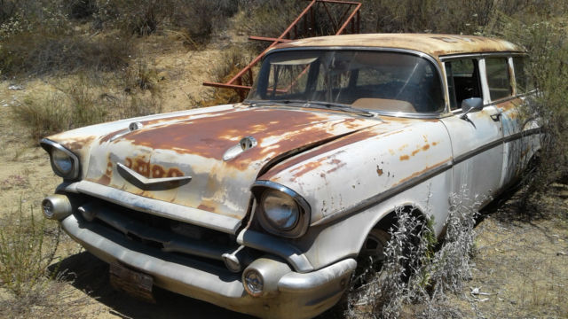 PROJECT CAR Up for your consideration is a 1957 Chevy 4 door wagon with a 1958 Corvette V8 motor with double hump fuel injection heads, 4 barrel carb and 4 speed trans that came out of a corvette the owner wrecked and still has. This car is the ORIGINAL India Ivory/Canyon Coral colored car that was a daily driver for years and was featured in the 1981 Esquiremagazinewith the owner and JackNicholson sitting on the hood. The original motor and trans may beavailable, theownerhas it still in storageI will answer questions as best as I can, this is part of aliquidation of project cars that will be offered. Sold as is with all it'S faults, no promises made, pick up or arrange for your own shipping. I RESERVE THE RIGHT TO END THE AUCTION EARLY DUE TO BEING OFFERED FOR SALE LOCALLY. On Jun-09-16 at 15:47:36 PDT, seller added the following information: I was able to get a better look at the car, the floor boards in the front drivers side have rust and some of it is missing as well as the rear quarter panels have a few dents. The car came with the 265 and the 2 speed auto trans. |