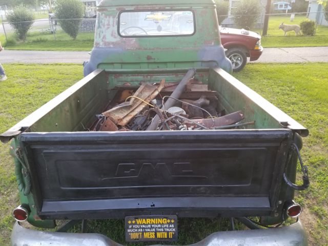 1956 GMC 100. Shortbed, step side, small back glass. Has a 350 bored 40 over. 350 Turbo transmission. Brand new front fenders, inner fenders, mirrors, taillights, starter, carburetor, has refurbished steel wheels with new tires, new GMC hub caps, all emblems come with truck, new seat, also have a 1955 GMC that comes with the truck to be used for parts or to fix it has a clear title also. All brakes have been gone through and replaced including master cylinder, brakes, and brake lines. New set of fiberglass fenders, I have all original metal fenders. Needs some work but very fixable. Comes with brand new wiring harness, a complete new stainless bolt and nut set from LMC for truck front to back. There's a ton of extra parts, as you can see in the picture, too many parts to list. I also have a 3 speed transmission out of the 1955, and I also have the original motor out the 1955. The 1956 was a factory 4 speed hydromatic, but I no longer have that transmission. It has a cracked windshield, wing glasses are cracked, some rust on bottom of driver side door, driver side rear fender, a very small spot on each cab corner, and a little bit on the back of the passenger rear fender. Drivers side floorboard and passenger floorboard has a small hole, but have new patch panels. Overall would make a good classic project truck without a lot of work. Starts, runs, and drives!