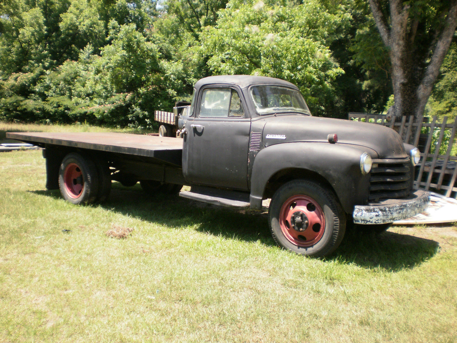 | 1954 One Ton Chevrolet Truck with steel flatbed. This truck has dual rear tires. All 6 tires are in good condition. The truck has earlier front end parts. The fenders and grill are from earlier truck model. Vin # starts with H54. One piece windshield and dash is all 1954 stuff. 5 window cab has corner windows. The truck runs and drive good but needs carburetor and brake work. Needs all glass and floor pans. I have purchased new floor pans and they will go with truck. Seat is in good condition. The engine is an inline 6-235 CI. The transmission is a 4 speed with double low and works good. |