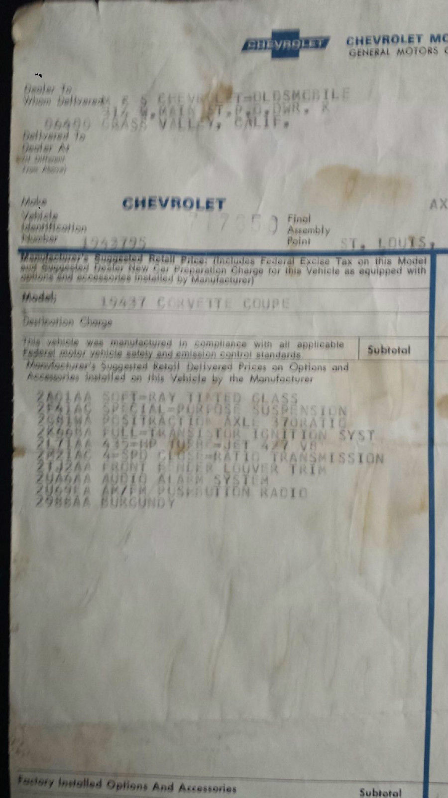 | For sale 1969 L-71 427 Tri-power Corvette Coupe. All Numbers Matching Born with Drive Train. 64. 00 mile California. Black Plate. 2 owners. rare!!!! The car is documented by the original Protecto-plate. window sticker. Tank Sheet still on car. Delivery Dealer inspection sheet. owners registration dating back to day one. with the California Black Plate. car comes with the "Black Plate. and all original stickers and Documents!!!Original owner from 1969-2010. As you'll notice the car has A/C and if you know L-71 Corvette's you know they never had Air Conditioning. This owner had it dealer Installed in 1969 using l-68 brackets and components. the car has had one repaint and is a 8. 5 out of 10. Car is completely rust free. and has a no hit body. only 64. 00 original miles. Options on Window Sticker are:2A01AA SOFT-RAY TINTED GLASS2F41AC SPECIAL PURPOSE SUSPENSION2G81WA POSITRACTION AXLE 370 RATIO2K66BA FULL-TRANSISTOR IGNITION SYST2L71AA 435-HP TURBO-JET 427 V82M21AC 4-SPD CLOSE-RATIO TRANSMISSION2TJ2AA FRONT FENDER LOUVER TRIM2UA6AA AUDIO ALARM SYSTEM2U69EA AM/FM PUSHBUTTON RADIO2988AA BURGUNDYThis car has a clean Minnesota Title. Happy Bidding. for questions call Matt @ 651-332-1587. |