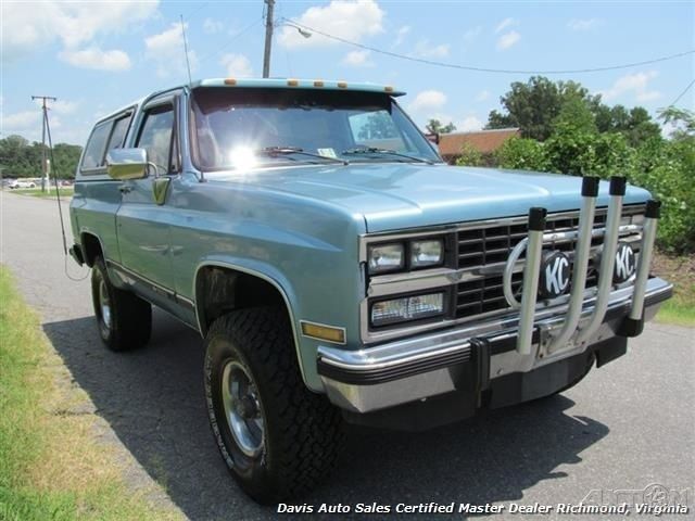 1991 Chevrolet K5 Blazer 4x4. 5.7 350 V8, automatic trans, Silverado package, loaded power options interior. Another incredibly solid square body find. This was a locally owned truck, lifted approximately 2 inches, riding on brand new 33 in all terrain tires, wrapped around rally wheels, engine runs out strong, transmission is a Jasper replacement. This vehicle is about as rust free as you find these classic trucks. AC even still operates, factory jack and all decals still under the hood (pictures to show), headliner is even intact. This is a very non-messed with well preserved classic SUV. Spare tire, clean Valore interior leather wrap dash, removable top, and so much more. About the only negative to this truck to really speak of are the common slow power windows, but even the rear window operates perfectly and the tailgate etc. Call for details about this truck and any other photos that you may want. We will be happy to provide!!! We have just serviced and inspected this truck and performed quite a bit of maintenance. Ready to enjoy.
