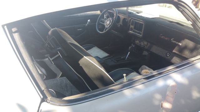 | 1979, Chevy Camaro Sedan for sale with a 350 HP engine with a 4 cylinder carburetor. I have Holley headers available for you to install which come with the car. The vehicle has 2.5 inch piping from the headers to the back end with large exhaust pipes on the tip. Chrome Kragar wheels. Back end is lifted with leaf supports and air shocks. Interior is custom upholstery, black with white racing stripes. |