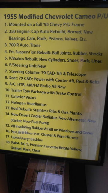 REALLY NICE DRIVER, OLDER RESTORATION BUT STILL IN REAL GOOD CONDITIONMounted on Full Frame 95 Chevy Pickup Frame350 Engine RebuiltRebuilt 700 R AutoRebuilt Front suspensionRebuilt New brakesPS Unit NewSteering Column from 79 CADSeat 79 CAD powerAC newAM/FM newHTR newTrailer Tow PackageExterior VisorsHalogen HeadlightsRebuilt Bed with New Stainless and WoodNew RAD, ALT, Starter, Fuel PumpNew weather-stripping at time of RestorationNew NO LIMIT Inst, ClusterNEW Custom Hound tooth uphNew Paint, ( shows some age now, But still nice)Took this in Trade for a Mustang, Really don't know the Value, So try an Offer if Interested All Items are sold as-is. if there is any problems. Please call me before leaving any feedback.I will work out any problems with you. 559-978-7669 Matt