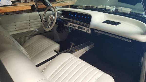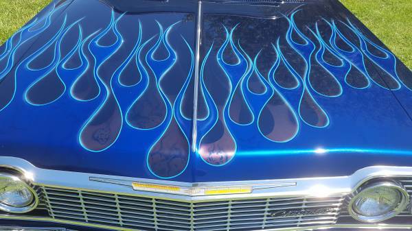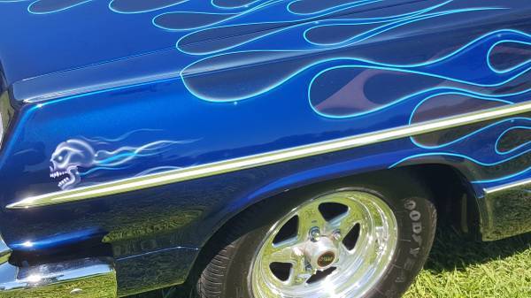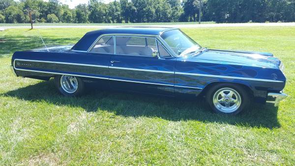Up for auction is a 1964 ProStreet Impala Indigo Blue with 7000 hours, this vechile was restored in 2005. So lets get into the nuts and bolts of this. Rear suspension: complete art morrison, frame rails from rear tofront clip, 9" Ford rear 411 gearscoilers with ladder bars. Front suspension, new coil springs rebuild a arms, new 4 wheel disc brakes 2"drop spindles. Theengine is a 454 LS6 crate, all roller, 3500 stall,tci turbo 350, alum radiator with Hedman headers also Dakota digital dash, stereo with a 1000 Watt amp with two 8" woofers and six disc cd player. Please check all photos and ask question, thanks for looking.