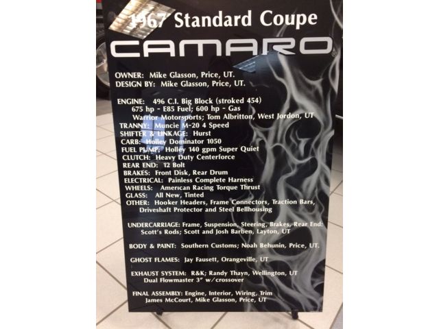 Contact SellerSee our other listingsPrint this listingCUSTOM Manual Year Make Model VIN 1967 Chevrolet Camaro 123377N103572 Stock Number Mileage Transmission Engine 4K379 100000 Manual 8 Cylinder. 496 CI L Exterior Color Interior Color Title Black Black Clear PhotosContact Us Karl Tyler Chevrolet 3663 N RESERVE ST MISSOULA. MT 598081527Call Us Today(406) 207-0684Ask ForSteve EdgarAsk Us A QuestionThis 1967 Camaro is owned by one of our local customers who after getting married and family needs to sell. Car was bought from Customer who built in Utah and has the following equipment. Karl Tyler Chev is only helping customer sell car and is not in our inventory nor belong to us. Warranty InformationCar is as is No Warranty. Vehicle History ReportDon't buy a used car without CARFAX®! The first step to protecting yourself against buying used cars with costly hidden problems. CARFAX® searches its nationwide database and provides a detailed vehicle history report in seconds. Terms and ConditionsDeposit: Payment: Items will not be available for pickup or shipping until full payment is received and cleared by our local bank. Buyer has 5 days to pay. Warranty: Equipment is covered by manufacturers warranty only. Rebates listed in any of our ads can vary by region. Any regional rebates used will be Western Region. If you live in another area please contact Steve to see what rebates you may qualify for. Financing: We offer financing competitive financing through several sources available to out of area customers. Contact Steve to apply for financing. Availability: We reserve the right to remove this listing due to on-site sales. Fee and Tax Information:All state taxes and fees owed by purchaser are to be paid by purchaser directly to their state as required by law. We do not license vehicles and only provide a 40 day temporary registration. About Us We have enjoyed being in the car business for over 40 years and being in Missoula for over 25 years. The reputation of our dealership lies with our great customers. such as yourself. Whether your needs are the purchase of a new or used vehicle. service. parts. accessories. body work or towing services; you can be assured that our professional staff will do everthing possible to make your experience at Karl Tyler Chevrolet plesant and rewarding. See our other listings