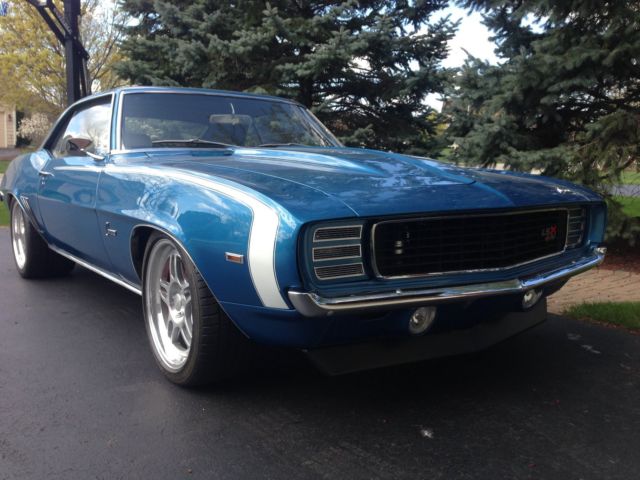 1969 Camaro RS This Camaro is an Original Lemans Blue (Code 71) RS. Is started as a barn find that went through a three year restoration to get it to the show quality piece that it is today. Here's the list of the details: 1969 Camaro RS Lemans Blue Body is all new sheetmetal including floors. Rear inner fenderwells were replaced with Detroit Speed mini tubs to accommodate 335-30-18 tires. The new floor has been undercoated on the exterior All interior sheetmetal is coveredwith Dynamat and Dynaliner. The interior has been completely restored to new condition using OER parts. A custom center console was installed. Center console uses factory bezel around shifter. The Guages were custom made by Speedhut to look correct to the era but with modern internals and GPS speedo. Tilt Column with Rosewood Wheel Vintage Air conditioning was installed Modern Seatbelts were installed Seat bracket extensions on drivers side to allow extra leg room for myself being 6' tall. Motor is a GM Performance parts LSX 454 with Callies Crank, Callies Rods, CP Pistons, LS3 Heads with Inconelvalves and valve job by Illmor. Quickfuel 850 Carb. Edelbrock Victor Jr. Intake manifold, Melling Oil Pump, Concept One Black Anodized Accessory drive, Behind Bars Billet Black Anodized Valve covers. MSD 6LS Computer Controlled Ignition, Custom Taylor Spark plug Wires hidden behind headers, Ignition coil relocation kit mounted on lower firewall. Kooks Stainless 1-7/8" Long tube headers. Hi-torque low profile starter. The motor was also Spintron tested at Ilmor. It makes 630 Hp naturally aspirated running on 93 Octane. The fuel tank is a Ricks 15 gallon Aluminum tank built for the narrowed stance. Transmission is a Tremec T-56 Magnum with a McLeod Twin Disk RXT Clutch. The shifter is a short throw that was offset to work in the factory console location. The Driveshaft is Cromoly. The rearend was built by Strange Engineering. It is Ford 9" with Nodular steel center. The Posi unitis a Strange S-Track with 4:11 and 35 spline axles. The rear suspension is a Ride Tech setup by Shwartz Performance. The front suspension rides on the factory subframe using Detroit Speed Upper and Lower control Arms along with QA1 Coil Over conversion and CPPC5 spindle conversion Custom 3 piece Wheels Built by Formula 43. Tires are Michelin Pilot Sport The steering is factory with an Upgraded CPP Close ratio steering box The brakes are CPP Big Brake kit with 13.5" disks. Wilwood Black Anodized Billet Master Cylinder, Booster and Proportioning valve. Exhaust is Stainless Works Full 3" System. I'm sure there are many things that I may have forgotten. Thanks for the Interest |