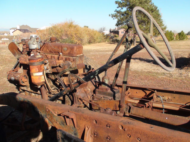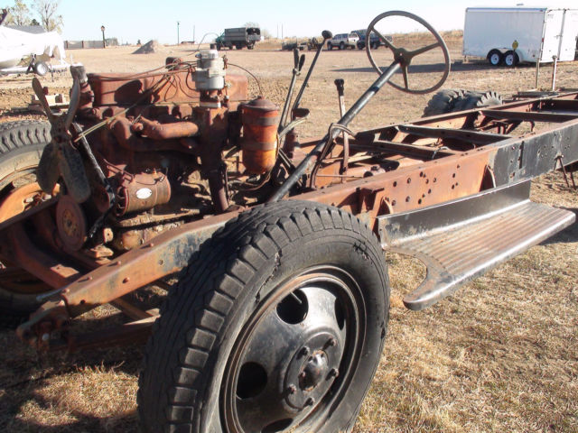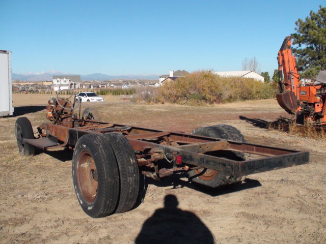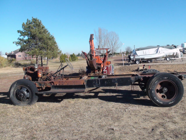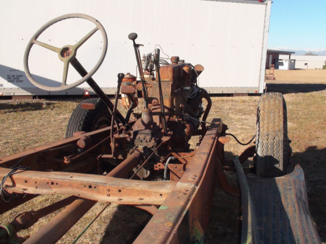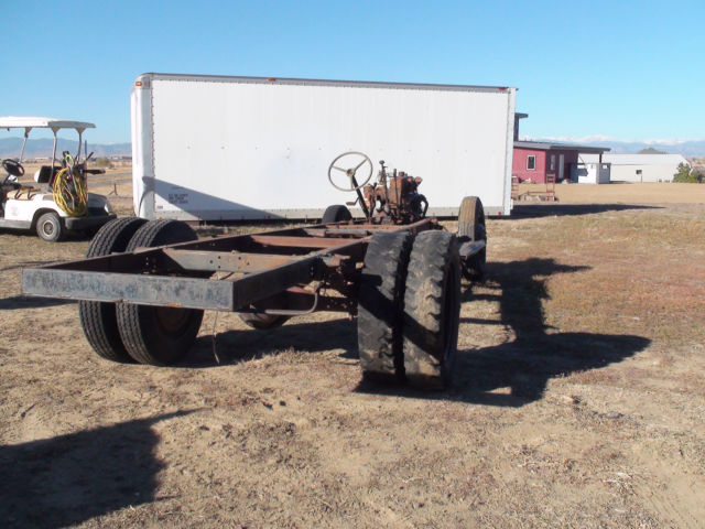 | I have a 1944 1 1/2 ton truck for sale. I took the body off as you can see, and selling the rolling chassis and engine, and tranny. The tranny has a "PTO" power take off for a grain box that used to be on the truck. I haveno idea of how many miles because the speedometer was broken. |