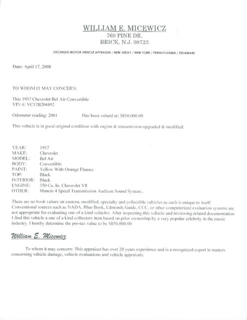 1.Bruce’s first set of wheels, purchased May 21, 1975 for $2,000. 2.The artist’s signature songs “Born To Run”, “Thunder Road” and “Backstreets” were written in this car. 3.Featured in Bruce’s autobiography titled, “Songs” he writes: “In ‘70’s New Jersey, the car was still a powerful image. That summer I bought my first set of wheels for two thousand dollars. It was a ‘57 Chevy with dual, four-barrel carbs, a Hurst on the floor and orange flames spread across the hood.” 4.The lyrics for the song “Racing In the Street” came from this ’57 Chevy: “I got a sixty-nine Chevy with a 396 5.Featured in the book titled, “Backstreets” by Charles R. Cross, noted Rock n’ Roll historian names this vehicle “The Ultimate Springsteen Collectible”. 6.After the release of Bruce’s record “Born To Run, the car was featured in the October issues of both Time and Newsweek Magazines, ironically both on page 57. 7.The car was featured in the March 1976 issue of Playboy Magazine and appeared on various promotional items including a poster and t-shirt. This 1957 Chevy Convertible became virtuously synonymous with Bruce Springsteen. 8.From October 2008 until January 2010, the Chevy was featured in the Rock n’ Roll Hall Of Fame Annex in New York City. Mayor Michael Bloomberg posed in the vehicle for pictures. This car was the most popular artifact at the museum. 9.In January 2010, the Chevy was moved to the main Rock Hall Of Fame in Cleveland, OH where it became part of the largest Bruce Springsteen exhibit ever. 10.Bruce was forced to sell the car in the Spring of 1976 due to his new found fame, it stood out too much, so he purchased a more subtle 1960 Corvette in black, which he still drives to this very day. No other Bruce Springsteen car has been offered for sale. 11.The ORIGINAL vehicle registration, temporary insurance card and Allstate insurance card in Bruce’s name and address are included with the car. 12.The Time, Newsweek and Playboy magazines featuring the car are included. 13.An extremely detailed color book encompassing 80 pages has been compiled by noted Bruce Springsteen historian, Michael E. Crane including all documentation and known history of the vehicle. A copy is included in the sale. 14. Themechanical and electrical systems of the car have been entirely overhauled, the body and frame are untouched just the way Bruce owned it. 15.Mechanical: The motor was replaced with a custom built GM 350, a single barrel chrome plated carburetor by Edelbrock was installed. Chrome plated custom valve covers with Chevy logo, chrome plated PVC valve and air intake as well. All belt pulleys are chrome. Power brakes were installed with new rotors. Muncie 4 speed manual transmission was rebuilt, replacing gears 2 and 4, original Hurst shifter with wooden knob remains. The radiator is rebuilt, steering rods replaced, heating coil and fan replaced with OEM parts. Gas tank was dropped, cleaned and re-installed. The entire engine compartment was stripped, power washed and repainted black. The manufacturing tag is present and highly visible. The exhaust system is a pair of aluminum coated magnaflow mufflers with chrome plated tips on the pipes. The car rumbles like a Harley!! 16.Electrical: The wiring harness was replaced with new. A chrome, extra large alternator was installed to power the electrical system. The $5,000 stereo system features Audison amplifier, Hertz component speakers custom built into kick panels at the front of the car. Bass speakers are built into the floor panel in rear of car. The stereo is unbelievably loud and clear at high speeds with the top down. The motor for the convertible roof was replaced in addition to the hydraulic pistons. The clock was replaced with an OEM part. New voltage, oil pressure and engine temperature gauges are featured under the dash and a new tach mounted on the steering column.