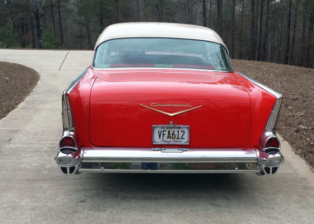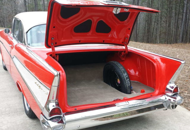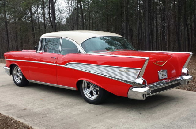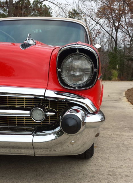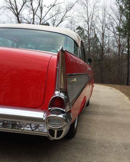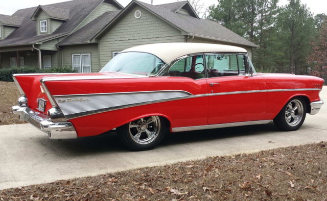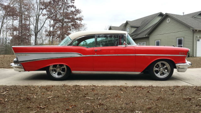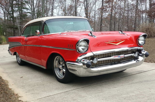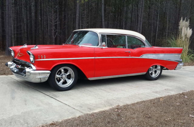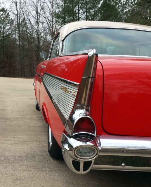 1957 Chevrolet Chevrolet Bel Air Restomod Full frame-off restoration performed in 2015. only 2700 miles since completion Built from a very solid southern car that had never been restored or moleste, still had original black body with white top. Originally built in Atlanta, Georgia Originally a 283 Power Pack with Powerglide, dual exhaust, factory power steering and brakes. All updates are bolt-on. Mild 310 cu in (.030 over 305HO, balanced and blueprinted) dressed to look like the original 283 gives a nice small performance increase over the 283. Pertronix distributor. Street Demon carburetor. Rams horn exhaust manifolds. Rebuilt 1991 model four-speed 700R4. CPP 500 Power Steering box. CPP new original style steering column. CPP extra caster stock style upper control arms. Front sway bar. CPP 2” lowering spindles and 2” lower rear springs. CPP Power Disc Brake setup. Rostra Cruise Control. Vintage Air Heat and Cool. Dakota Digital analog gauges including clock. Retrosound stereo system with MP3 and Bluetooth for cell phone. American Autowire complete wiring harness. New gas tank with sender. Upgraded Ciadella interior sewn in original pattern with all new door panel moldings. All new chrome bumpers, tailights, headlights, grill, rocker moldings, side inserts, emblems and handles inside and out. Polished stainless. Every piece of glass is new including chrome side window frames. All new weatherstripping, fuzzies and window channel etc. Laser straight body treated to a bare metal paint system (all surfaces outside, inside and underneath) starting with epoxy primer, urethane primer surfacer and urethane top coat, Light Buckskin over Torch Red. Color sanded and buffed. 17” American Racing Torq Thrust Polished Wheels. 215/60-17 Continental True Contact tires. This car drives and handles great. The combination of the increased caster and modern wide radials really increase the cars handling. This lovely, Bel Air is ready to tour, show, and enjoy with pride. Fly in, drive home. Please call Steve at 205-422-8967 for any additional info. My sale policy is simple, a $200 deposit is required within 24 hours. If you don't want the car when you come to pick it up you only forfeit the small deposit to cover my ad expense. The State of Alabama does not issue titles for vehicles of this age. A notarized bill of sale and tag registration will be furnished. |