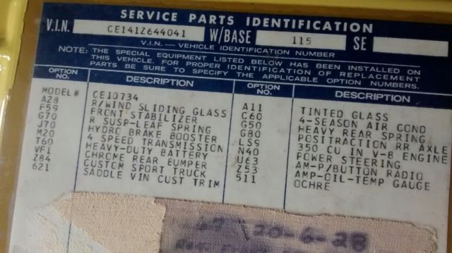 1971 Chevy Cheyenne CST original matching numbers 350engine M20 Four Speed Transmission on the floor Factory 12 bolt posi rear end Factory front disc with brake booster, Power steering, Rear back sliding window Short Bed (Rhino liner) Factory AC, (needs work) New Battery New Alternator Spare tire I have brand new front lowering springs ( not installed) Brand new Upper molding (not installed) All the lights the fuel gauge temp gauge, Batt gauge speedometer, flashers turn signal - Work All vin numbers match from SPID( Build sheet), chassis, motor, trans and rear end Super solid California truck Goes everywhere/Runs like NEW at 75MPH or more on the highway like nothing. |