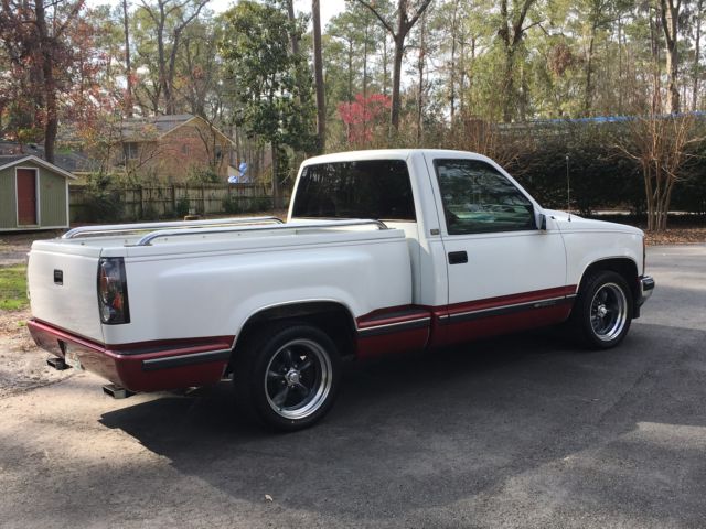 1992 CHEVY STEPSIDE 350 ENGINE BORED 40 OVER COMP THUMPER CAM, SUMMIT HEADS, SUMMIT ROLLER ROCKERS, SUMMIT GEAR TO GEAR TIMING. THE STEERING GEAR HAS BEEN REPLACED WITH A CLOSE RATIO UNIT MADE BY AGR PERFORMANCE. INTAKE IS SUMMIT WITH ELDELBROCK 4 BBL CARBURETOR, HEADERS ARE STAINLESS SHORT, EXHAUST IS A TRUE DUAL SYSTEM WITH FLOWMASTER MUFFLERS. SUSPENSION HAS BEEN LOWERED 3"FRONT 4"BACK USING ALL BELTECH SPINDLES, SHOCKS AND SHACKLE KIT. TRANSMISSION IS A 700R4 WITH A BOSS HOG 2500 STALL. THE REAR END HAS BEEN PROFESSIONALLY BUILT WITH A 3:73 POSITRACTION UNIT. THE TRUCK BODY IS IN REALLY GOOD CONDITION WITH NO RUST. ALL PAINT IS ORIGINAL EXCEPT HOOD, TAILGATE AND FRONT FENDERS. ALL BODY PARTS ARE ORIGINAL EXCEPT COWL HOOD. FACTORY FOG LIGHTS HAVE BEEN INSTALLED AND FUNCTION LIKE ORIGINAL EQUIPMENT. THE INTERIOR IS ALSO ALL ORIGINAL EVEN DOWN TO THE FLOOR MATS. DASH HAS SOME CRACKS, BUT I HAVE A REPLACEMENT THAT IS IN GOOD SHAPE. THE DRIVETRAIN OF THIS VEHICLE HAS LESS THAN 5000 MILES SINCE BEING REDONE.