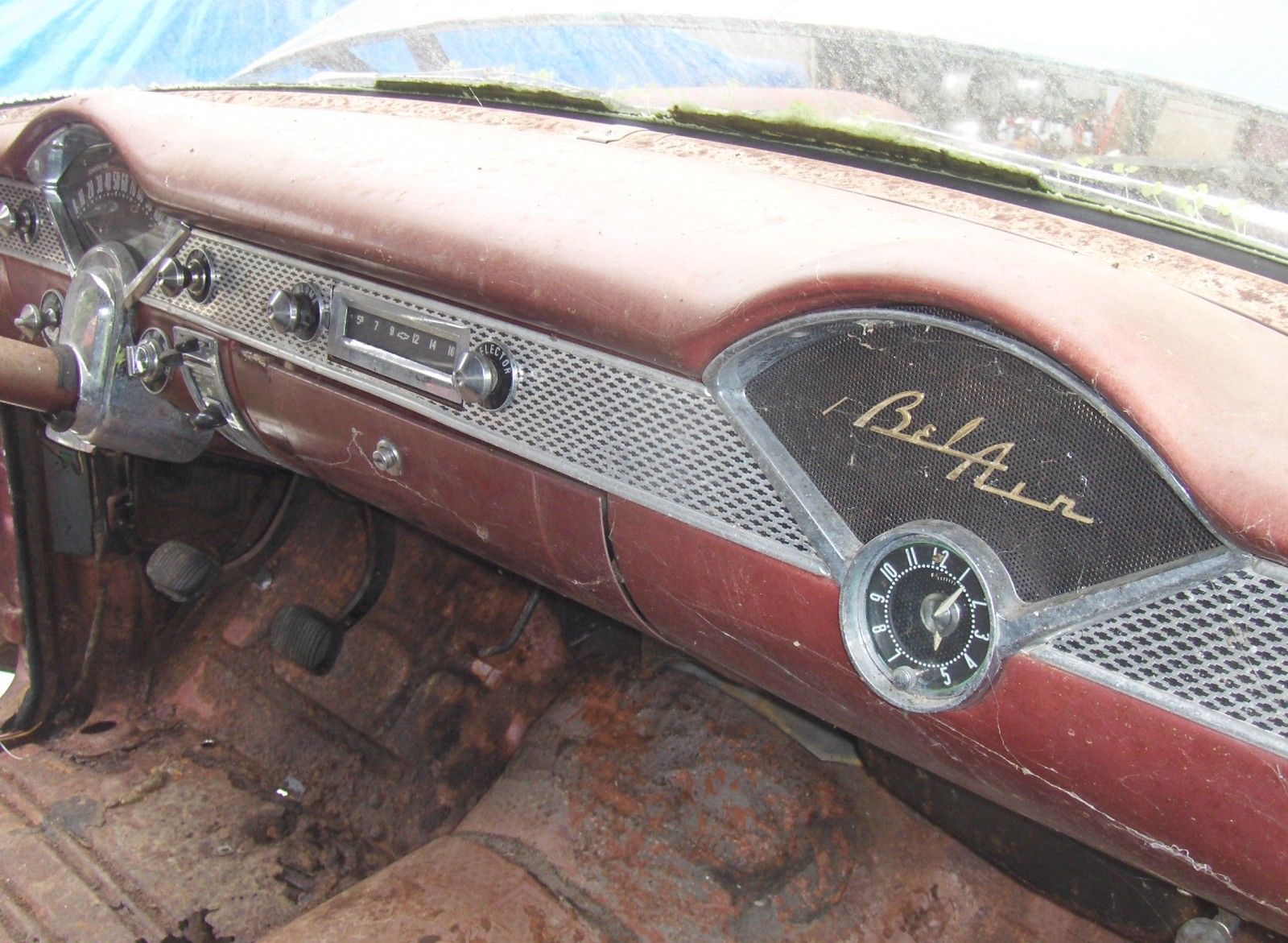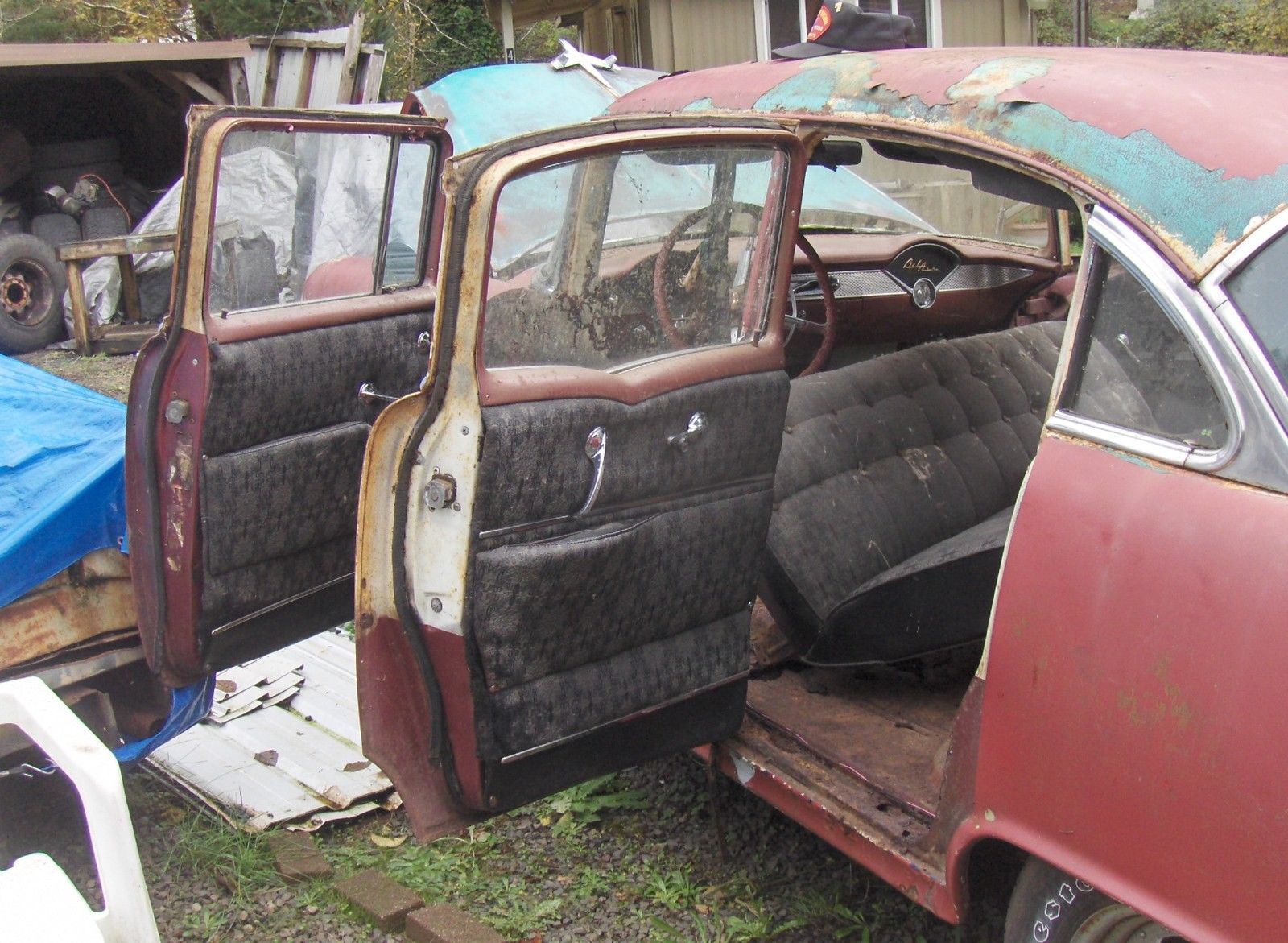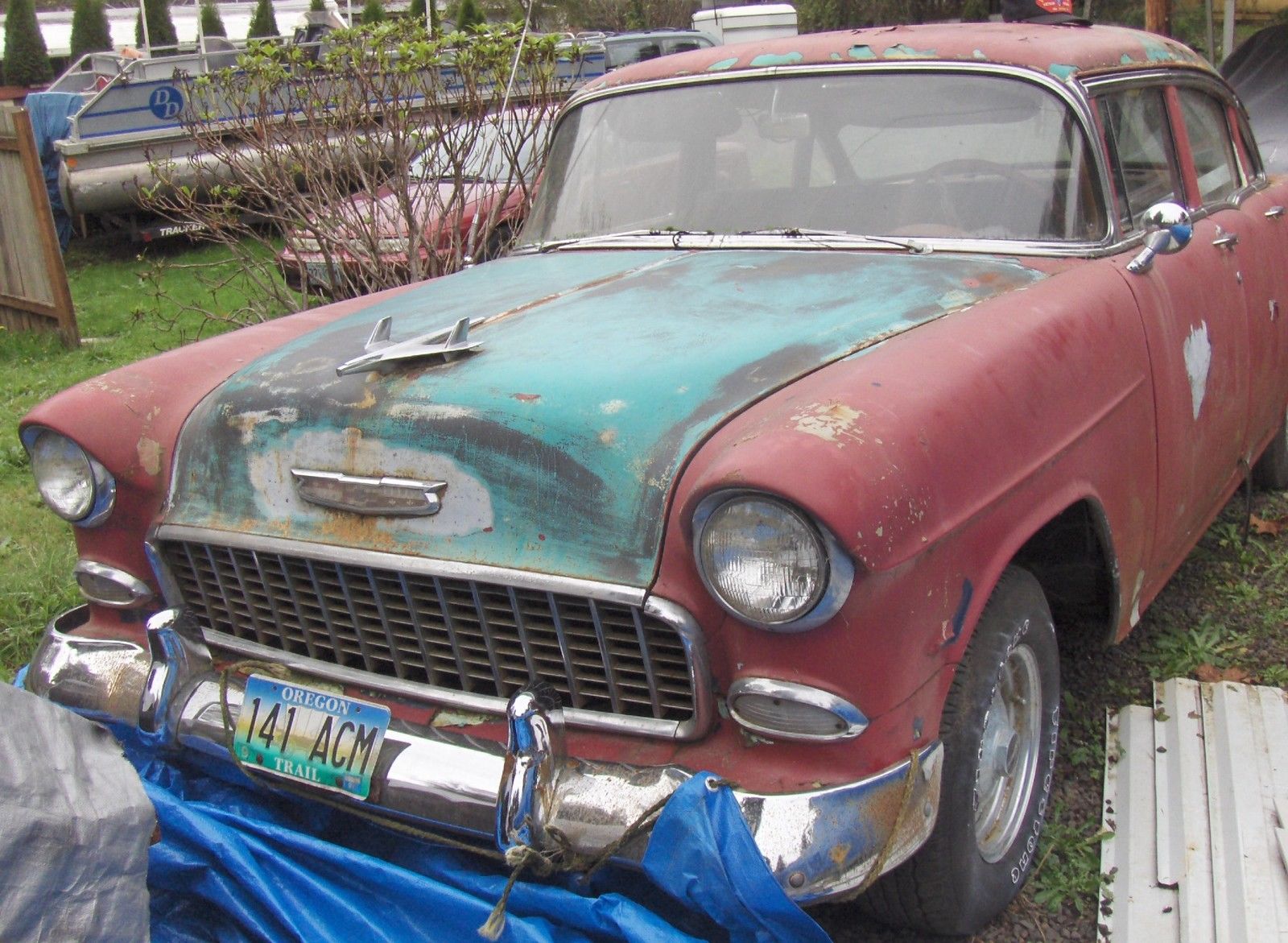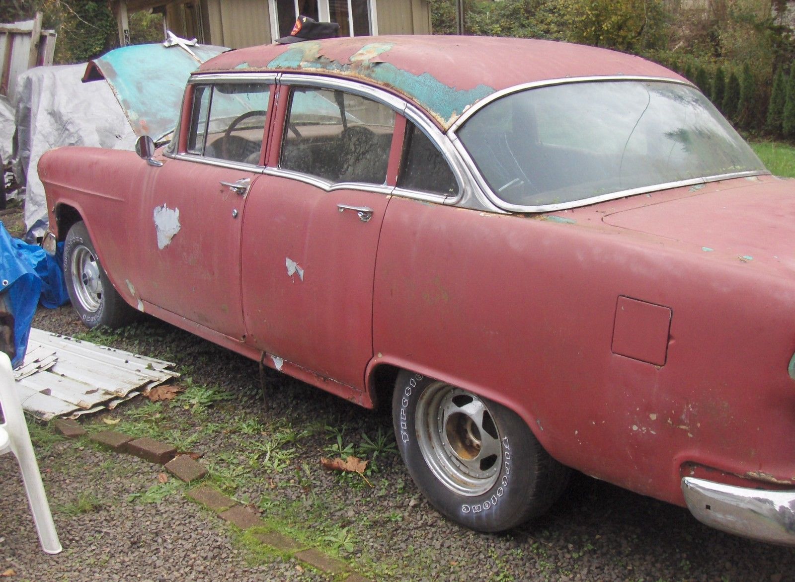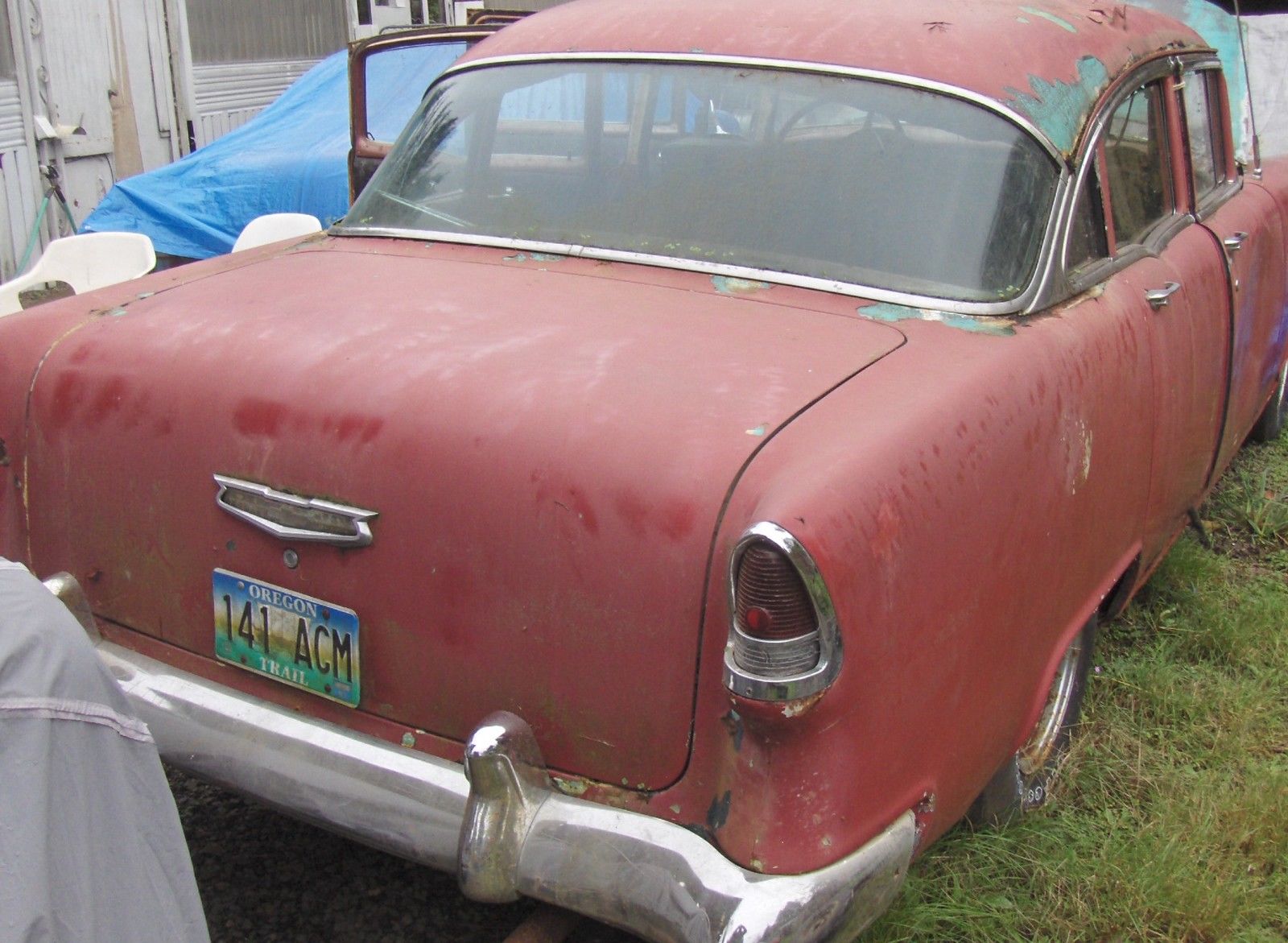 55 4 door. did start and move in yard 2 years ago. needs floors and inner rockers. nice bumpers. nice seats and door panels. no headliner. very nice dash. great tires and wheels. everything worked . ast i tried. ights. urn signals. lower motor etc. great builder or parts car. pretty straight car with exception of pushin type dent on passenger front door. should pop out. rolls freely. tank and lines cleaned 2 years ago. has no brakes. master cylinder is frozen. tired 1959 283 with 500 holley 2 barrel. dual exhaust. 3 on the tree. true mileage unknown and is exempt. 971-645-0601. anytime. sold as is. here is with claen and clear oregon title. buyer pays and makes all shipping arrangements. can help with pick up. thanks