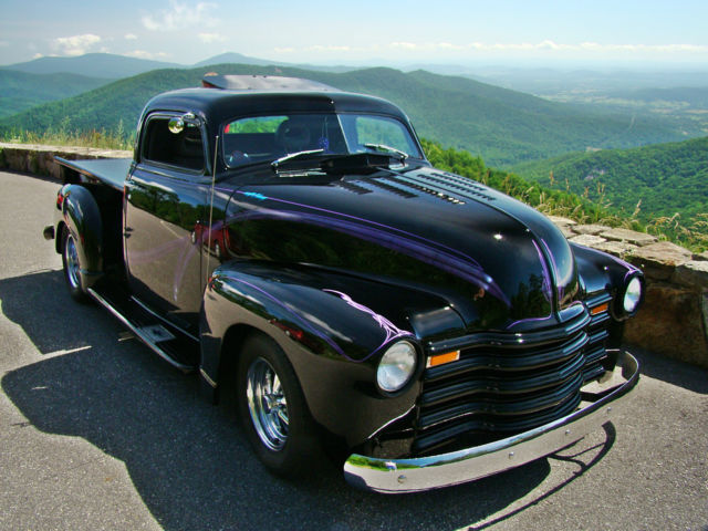 Our 1949 Chevy was built in 2005 by a professional body shop in NY. The body is all GM steel except the fiberglass rear fenders. The top has been chopped about 5”. It has an operating sun roof and the cowl vent operates as originally designed. The shop used a 1970’s Nova donor car for the front frame clip to include the power steering and power front disc brakes. They also used the Nova’s, 10 bolt, 3:08 gear rear end and front & rear sway bars. The shop installed a GM ZZ4, aluminum head, 355HP crate engine, Edelbrock 600 carb. B&M TH 350 trans & cooler. It has an aluminum radiator and an original type GM interior box heater that works just fine! It has a 16 gallon, between the frame, rear mounted metal fuel tank with inside bed access. It has an Alpine head unit with 4 speakers and optional remote control. The bed is covered with a hinged one piece rigid fiberglass bed cover that hides the polished aluminum diamond plate bed floor and full sized spare tire/wheel. The purple graphics and pin striping was done by “Batts” out of NY. The other graphics....Cherokee Proud, Slacker, Princess and my blue haired avatar was done by Donnie Strother. Chuck at wherewereyouin62@comcast.net or 540-422-6546