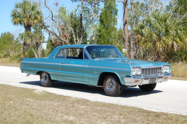 1964 Impala SS 409ci 4spd Dual quads VIN # 41447 R 162810 4 = 1964 14 = Impala SS V8 47 = 2 door sport coupe R = Arlington, TX 162810 = Production sequence number Cowl Tag 04E = 04 - April E-5th week BT = Arlington, TX TRIM = 815 - Black Impala Super Sport - bucket seats PAINT = 918 - Azure Aqua This Impala has been in a collection for many years. The restoration was done sometime around then. Seems to be a really nice original car with cowl tag, correct colors and options. The car has the 409, 4spd, and dual 4 barrel Carter carburetors, Non power brakes, and no power steering. This one was ordered for one thing..To go fast! Not sure if motor is original to the car or not. Overall it is a great running and driving car. The car idles just under 1000 RPM nicely. Here in FL while cursing around I have not seen the cars temp get over 190ish. The oil pressure shows around 75psi. Though, I noticed a drop of oil on the garage floor, it seems it could just be a rear main seal. If I have the car long enough, I will get around to fixing it. The brakes have been gone through sometime over the years and work surprisingly well to stop this massive car. The transmission and shifter feel good and the clutch has a good firm feel, and does not slip under the huge torque of this 409. The steering and suspension feel nice and tight as it should. Although not the easiest car to move around a tight space, the non power steering is not as tough as some of the older cars Ive driven over the years. The body is very very solid on this one. There looks to be no rust what so ever on this car and the pictures will show that the whole car was properly primed in the correct red oxide during the restoration process, which has sealed and preserved everything very nicely. The frame was powder coated as well during the restoration. The underside of the car is very nice as you can tell from the photos, floor pans have all been replaced it looks. You will see in one photo, it seems someone attempted to lift the car from the driver side rear floor pan, and it wrinkled the metalwork a bit, It could be hammered out but i don't see it being an issue. There is seam sealer on that same driver side inside rocker that is visible. Again, not much of an issue, but something to be noted. The chrome on the bumpers is not perfect but very nice condition. The trim work around the car is all intact and in excellent condition. There may be a piece or 2 that has a ding or dent in it, but again, something that would go overlooked unless pointed out. The glass is clean and free of scratches or cracks. You can tell the paint was done on the car a long time ago and is not perfect but very nice, and shows no bubbles or fish eyes, or any signs of bondo. The only spot I found with some bubbling was near the driver side taillights (see photo) seems like an odd spot for rust to form, so could be bad prep work or a repair, not sure. The trunk is solid, with no signs of rust what so ever. The interior is one of the nicest I have seen. Someone took a lot of time putting this one together, from the seats to the door panels, to the headliner, everything fits flawlessly and looks and even smells new. The dash is also in excellent shape and below the dash are 3 Sunpro gauges mounted nicely with Temp, voltage, and oil pressure. The center console is in great shape, the silver trim has some wear but looks to be original trim. The tach on the steering column has been updated with a Summit gauge and looks nice. I always suggest coming to see the car before bidding. If you have any questions just ask and I will do my best to get you a picture or the information you're looking for. The car is being sold as-is with no warranties or guarantees expressed or implied. Car is being sold locally as well, so I reserve the right to end the auction at any time. Please do not bid unless your funds are in place, and you are prepared to pay for the car. You can also call with any questions - 727-514-8678 Thank you. |