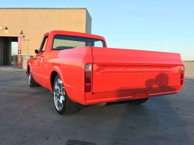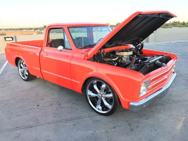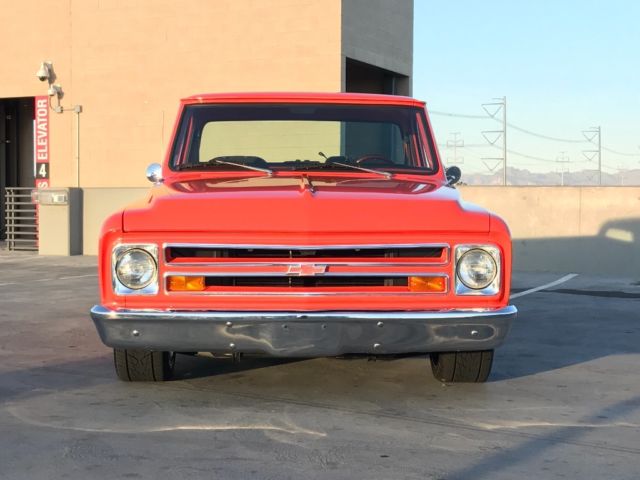 Up for auction at NO RESERVE is a fresh frame off restored 1968 C10. This truck started life as a factory big block, A/C truck and has been tastefully customized during this restoration. This truck received a full frame off restoration and you can tell from the undercarriage. The frame was blasted and painted as well. The engine compartment is clean and shows very well. By end of auction the new A/C compressor will be installed and system functioning properly. Drivetrain: The first oil change was just done on this very healthy 454! This motor is strong and fresh with an estimated 475-500 horse power. It is equipped with an Edelbrock Air Gap intake, Demon Carb, nice aggressive Comp Cam, long tubes, etc... Brand new 3" exhaust was just completed and sounds amazing. The 4speed auto is also fresh and crisp. The rear end was freshened and posi traction works perfect. New driveshaft was also installed at time of restoration. Suspension: All suspension is rebuilt or brand new. The front end consists of CPP drop spindles, drop springs and power disc brake upgrade. All ball joints, tie rods etc are fresh and tight. The rear suspension is equipped with CPP drop coils and upgraded sway bar. The rear trailing arms and components were also blasted and painted and look great. Interior: The interior was also painted in the matching orange and looks great. New black carpet kit, upgraded seats, and brand new Dakota Digital gauges! Also equipped with a nice Bluetooth audio system. This truck shows very well and the body work is straight, it is a very nice driver quality paint with a few minor blems here and there. Brand new 22" wheels and tires have less than 20 miles on them. The truck has a new chrome front bumper and welded in rear roll pan. Fuel tank has been relocated under bed and a custom filler has been molded into the bed. Bed is professionally lined and free of any major dents and dings. This is a turn key hot rod that has very few miles since completion. As always please only bid if you have your finances situated and are a serious buyer, $1000 non refundable deposit due with in 24 hours of auction end. Inspections and questions are welcome. Thank you and happy bidding. On Apr-23-17 at 10:27:02 PDT, seller added the following information: Links to YouTube clips:https://youtu.be/irrSw_YM-ighttps://youtu.be/HbwaI0DZLSM |