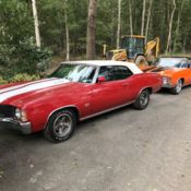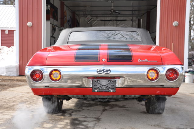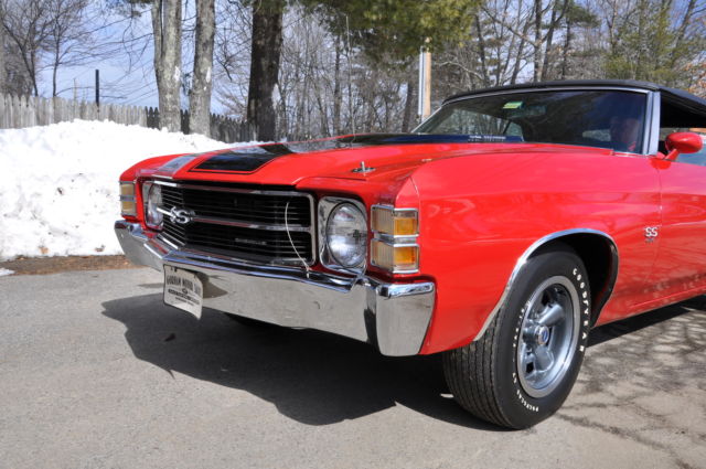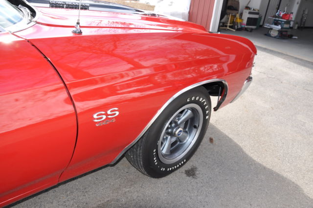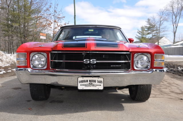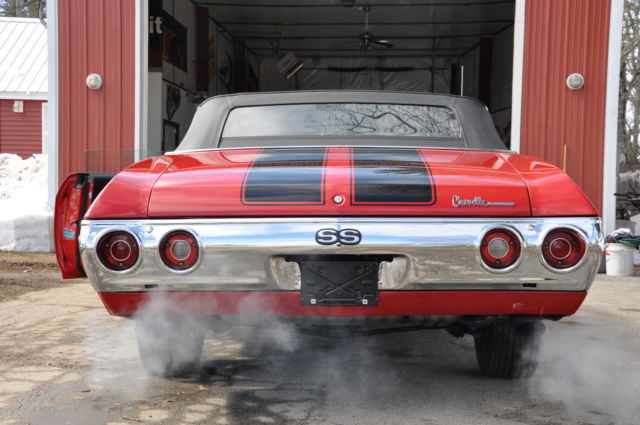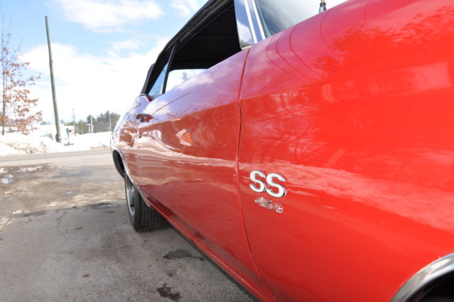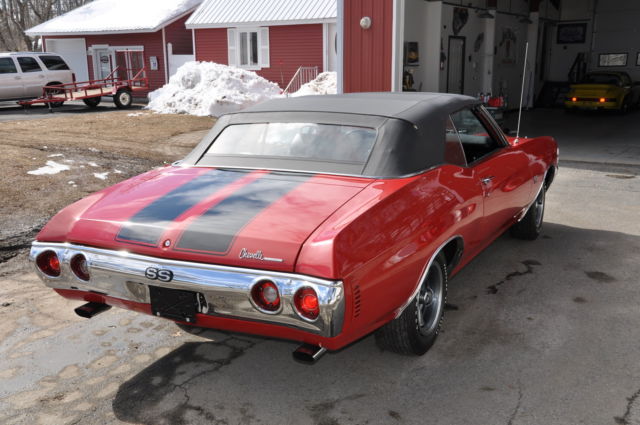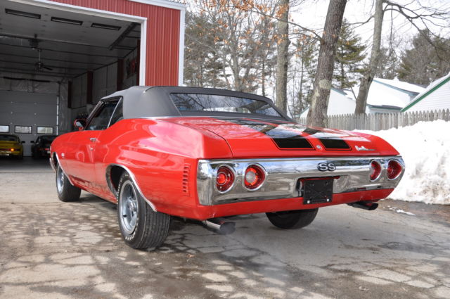 For this year 9,502 models equipped with the Z15 SS-454 equipment and it's estimated that only 36 of those were convertible. This car is a numbers matching Chevelle SS 454 (LS-5) convertible in red with black leather interior and black band-aid stripes with an M-22 4-spd transmission. Documentation includes Protecto plate and delivery jacket. Fully restored using NOS parts approximately 20 years ago and stored covered, in a climate controlled storage since. Mechanical: The car has an LS-5 motor that has been built to output 500hp and 510 ft-lbs of torque. The engine has Edlebrock performer RPM intake manifold and heads. The build utilized roller hydraulic lifters and roller rocker arms with a Crane camshaft. Engine machining includes boring 20 over, balanced, blueprinted, ported and polished heads. Fuel is delivered by a custom Barry Grant carburator. Exhaust system consists of ceramic-coated Hooker headers and a full stainless steel exhaust. The car originally came equipped with the N10 dual exhaust package. Drive train is composed of a fully rebuilt 4-speed, M-22 "Rock-crusher" transmission and H05 3.73 and G80 positraction rear end. The car originally came with M01 heavy-duty clutch; it is currently running a centerforce clutch.Suspension is equipped with the original F41 front and rear suspension package; rear suspension is an aftermarket Hotchkis setup. Breaking is handled by JL2 front discs with drum rear brakes. Additionally, the SS is outfitted with the N41 power steering package. Body: The body is in perfect condition. No rust and an excellent paint job. The car came with ZL2 special hood with cowl induction and functional hood lock pins; the cowl induction is fully functional.Car is equipped with the optional C06 convertible top and has been completely rebuilt and recovered. Glass is A01 soft ray tinted glass. Interior was completely restored. Seats are the original A81 option with head rests and bucket seats with the A49 custom deluxe seat belts with retractors. Interior includes the optional D55 console and U14 instrumentation package which includes a tachometer and clock. Originally the car had the U96 AM/FM radio with buttons. The radio is not installed at the moment. The car has the original ZJ7 Rally wheels with Goodyear polyglots F40 tires with raised white letters. This vehicle has been in my Uncle's private collection for over 10 years. It has rarely been driven, kept on a lift and covered in a climate-controlled garage. You will not find another like it for sale. Contact me for a video of the SS running. 936-five37-0860 Neal. See my other listings for more special-interest and collector vehicles.