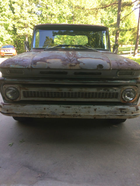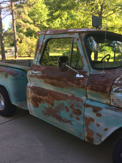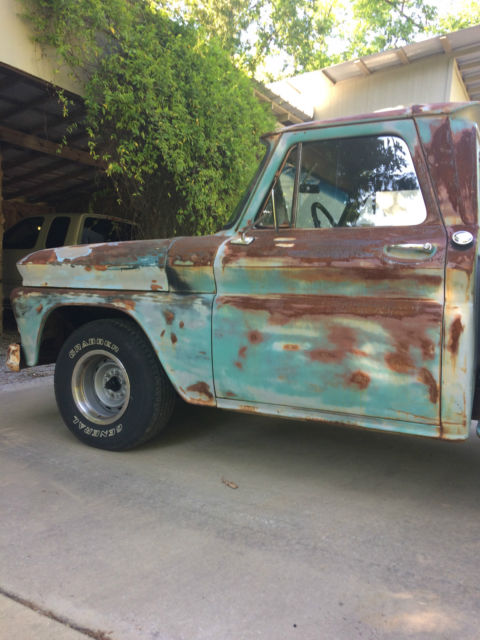 If you like patina, this is the truck for you. It is a 1965 chevy c10 swb. It has a strong running 350 with great oil pressure, no smoke, or any noise. The engine has a Edelbrock aluminum intake, a 600 edelbrock carburetor, chrome air cleaner and valve covers. Great engine. Behind it is a rebuilt 700r4 auto transmission. Here is a list of parts replaced on the truck, windshield, all rubber brake lines, brakes, wheel cylinders, tires, exhaust, both window regulators, lower ball joints, outer wheel bearings, seat cover, glove box liner, trailing arm bushings, windshield wipers, both door mirrors, radiator, both hoses, inner fenders,battery tray,and hood hinges. The truck has a later year tilt column, and power steering. It runs and drives down the road great and has a great sounding exhaust. The body does have some minor rust in the floors that need patched. The cab corners are solid the outer rockers only have a couple of small holes. The cab mounts are solid. The bed has some rust where the inside bed meets the floor but over all the truck is very solid. It is ready to be driven home. All the lights, turn signals, heater, and wipers work.The truck also has a custom rear bumper with led taillights and turn signals. I am sure I have missed some new parts, just ask questions and I will be glad to answer them. I have the truck for sale locally so if it sells I will end the auction early. No shipping, clear title.