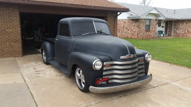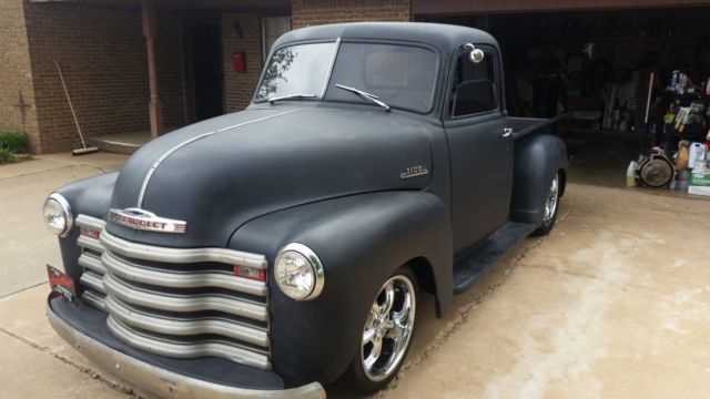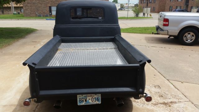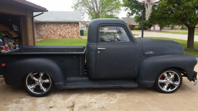1953 3100 Chevrolet short bed truck ground up built in hot rod shop. Engine 350, aluminum Edelbrock intake and carb, comp cam, new HEI, billet pulleys, chrome alternator, chrome air compressor motor, has 400 miles on it. Jegs fuel pump. Sitting on an 1988 S-10 frame with c-noches for air ride. All 4 airbags, 2 air compressors, 2 tanks all lines are ready and go with it. Right now it is riding on coil springs in front and coil and leaf springs in rear. New duel exhaust with thrush mufflers. New fuse box and wiring, new head lights. Interior is all new with autometer guages, nice red seats with console, good JVC sound system, custom floor mats. Custom old air conditioning system, new battery and cables. Body in good condition for 1953 and is all stock. Paint is Hot Rod Black and patina color. Custom bed diamond plate. New Dcenti chrom wheels and new tires. 20" in rear, 18" in front Runs and drives, gets thumbs up everywhere I go. Please don't bid unless you have the funds. A $1,000 deposit is due within 48 hours. Truck is for sale locally so this auction is subject to cancellation. |