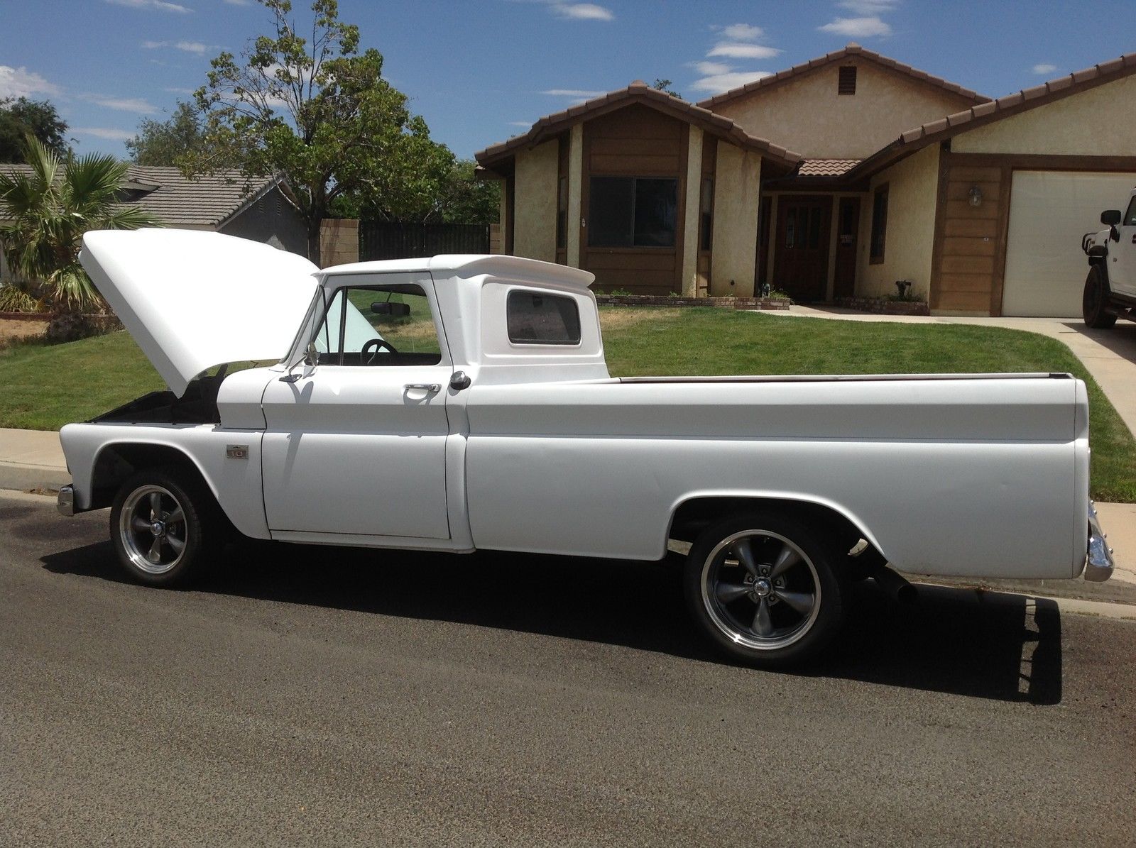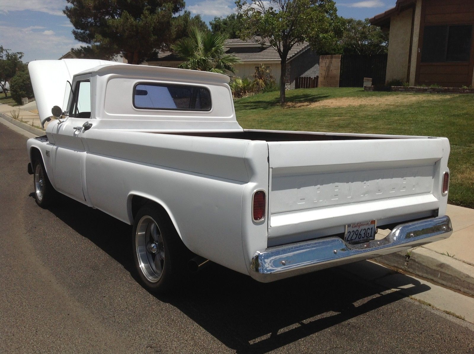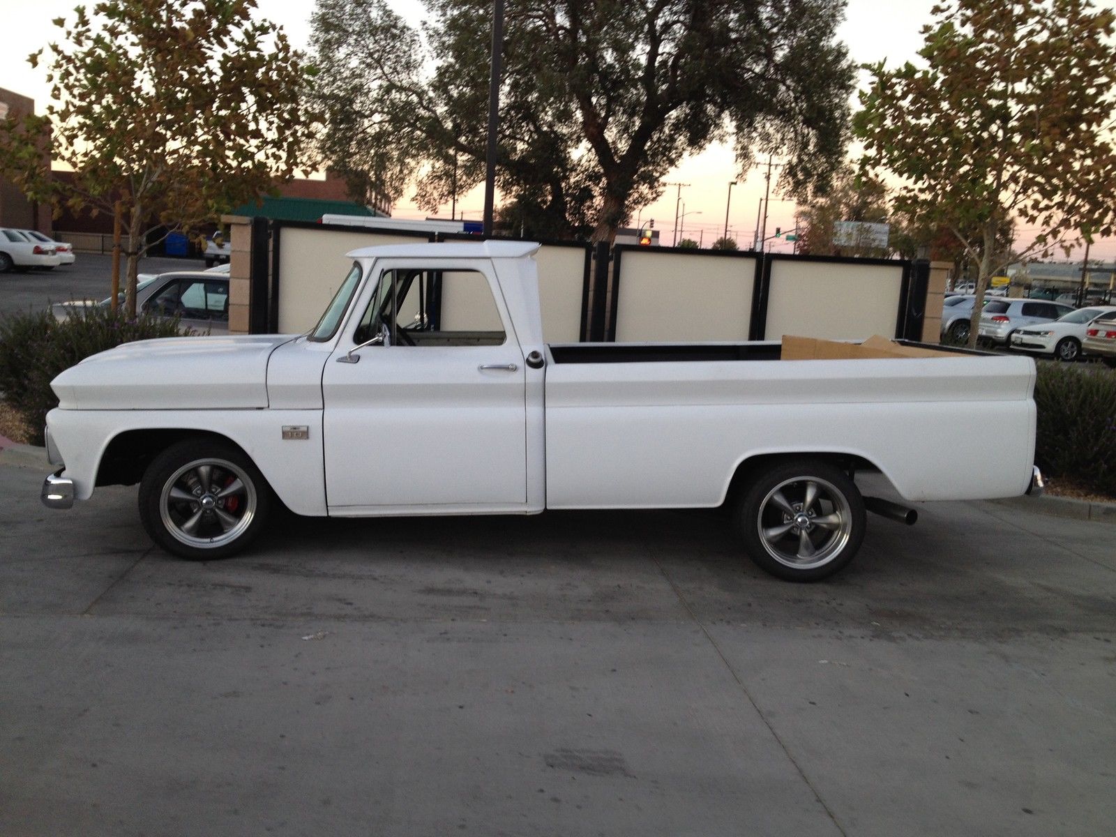 | 1965 chevy c10 . 5 year stored barn find. California truck! No visible rust except for quarter size hole in driver side floor board. Pretty clean truck. Newer chevy 350 V-8 engine. 4 barrel edelbrock carb. black edelbrock intake. hooker headers. edelbrock valve covers. flow master exhaust. new aluminum radiator. original bench seat refurbished with white nautical leather. Front disk wilwood breaks with 3. 5 inch drop spindles. all new front end. ball joints. bushings. etc. wood bed. new rims and tires. 95% tread. New Crome bumpers front and back. no leaks and head lights. directionals and horn all in working conditions. Power steering and power breaks. Daily driver!!! |