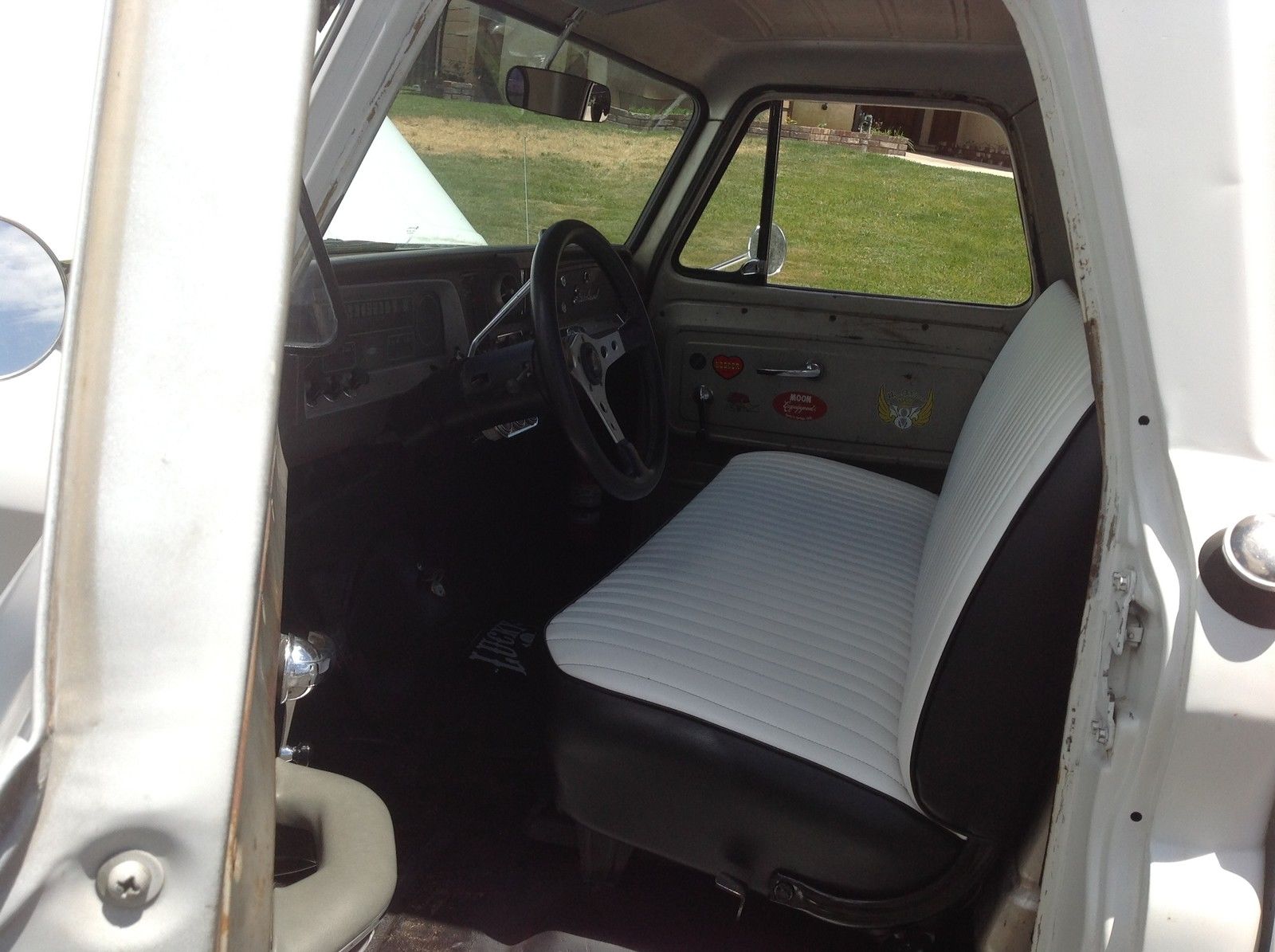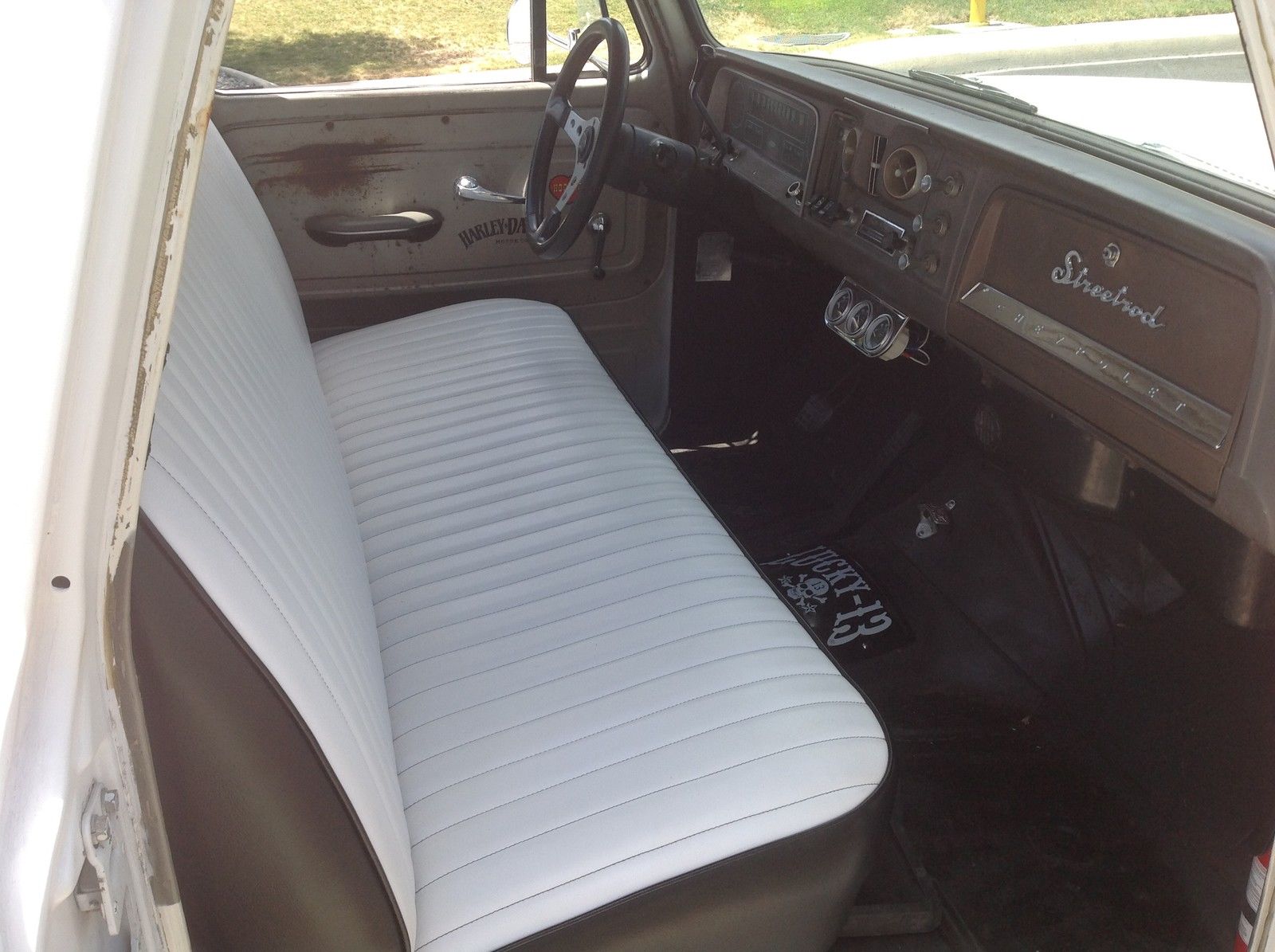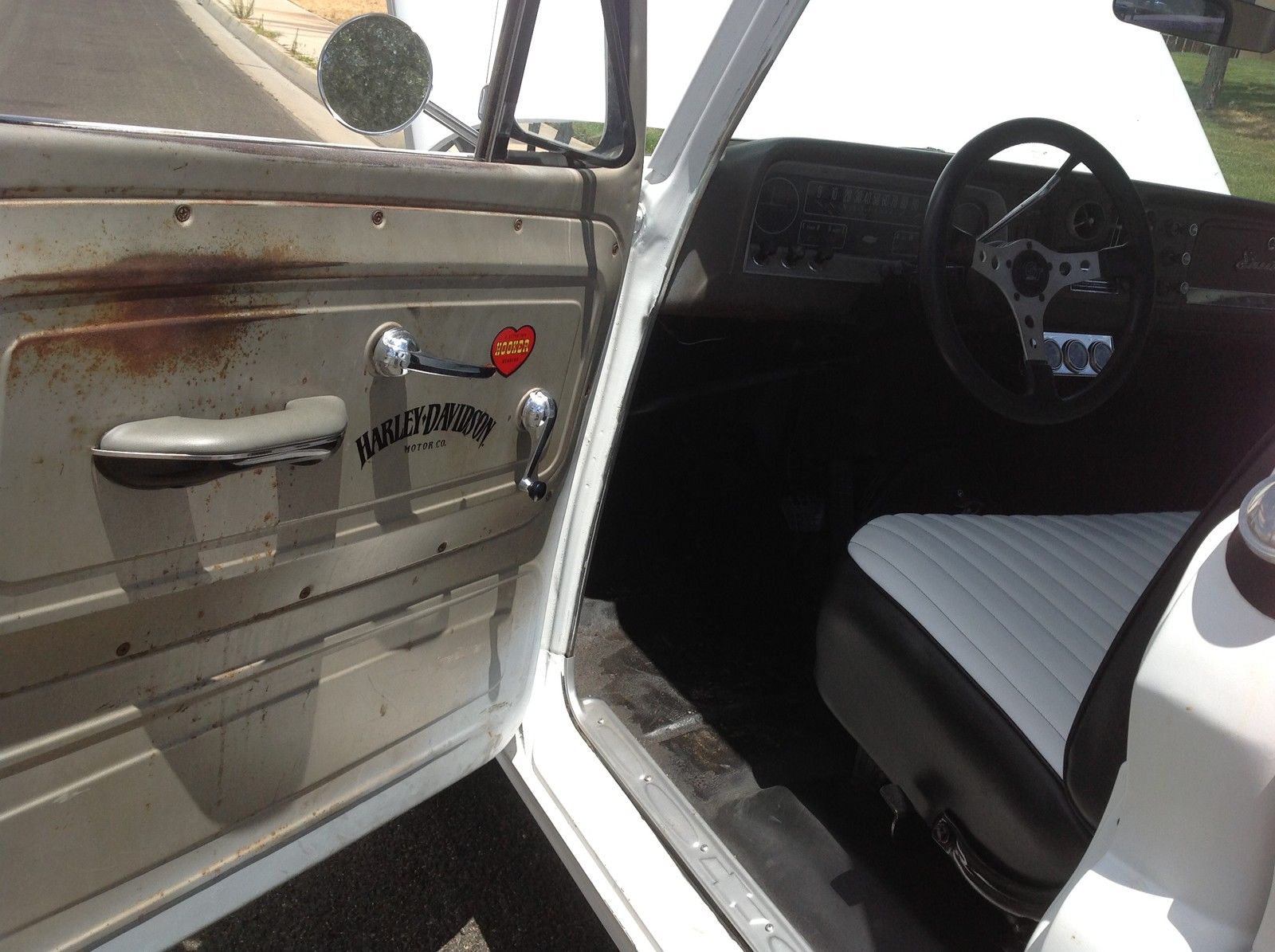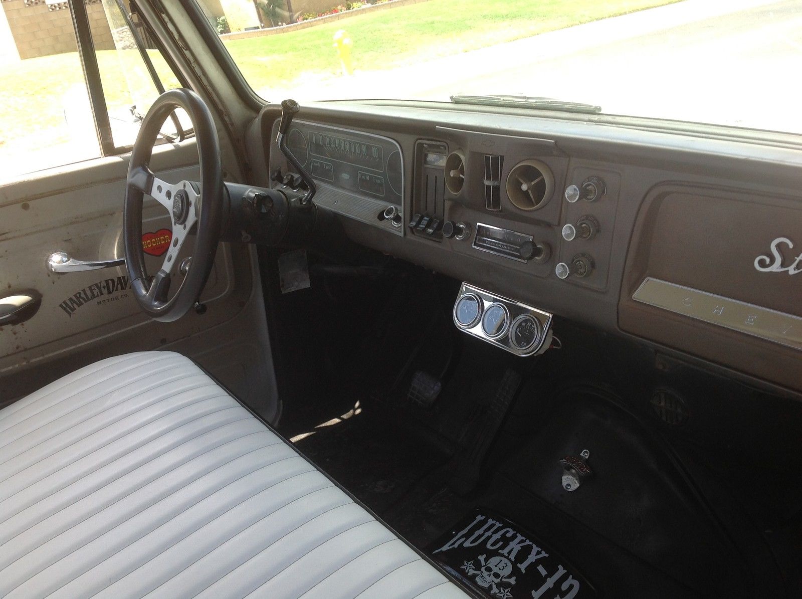 | 1965 chevy c10 . 5 year stored barn find. California truck! No visible rust except for quarter size hole in driver side floor board. Pretty clean truck. Newer chevy 350 V-8 engine. 4 barrel edelbrock carb. black edelbrock intake. hooker headers. edelbrock valve covers. flow master exhaust. new aluminum radiator. original bench seat refurbished with white nautical leather. Front disk wilwood breaks with 3. 5 inch drop spindles. all new front end. ball joints. bushings. etc. wood bed. new rims and tires. 95% tread. New Crome bumpers front and back. no leaks and head lights. directionals and horn all in working conditions. Power steering and power breaks. Daily driver!!! |
