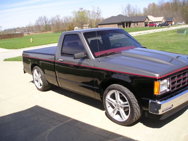 1984 S-10 standard cab -short bed. Motor is a new,( not rebuilt) 350 short block, 4-bolt mains and dish top pistons. Motor also has Howards hydraulic flat tappet cam, alum. heads with 2.02-1.60 valves, comp. cams full roller rockers, and girdle kit, alum. intake, and 650 cfm carb. Ignition is all MSD. Transmission is a 5 speed Borg/Warner T-5 with a hurst shifter. The rear end is the original 10 bolt with new 3.73 gears and a tru-trac posi. unit with all new seals and bearings. Exhaust system is all new with heddman long tube hedders and a complete summit 2.5" exhaust all the way to the rear of the truck. The brake system has been completely rebuilt from front to rear with all new hardlines, new power booster, master cylinder, and prop. valve. The front brakes are 14" corvette units and the rears are 12" corvette units. The wheels are also from a corvette with the fronts being 18X8.5" and the rears are 19X10.0". The tires are all BFG G-force TA with 245/40/18 on the front and 295/35/19 on the rear. Truck has new shocks and 3" lowering springs on the rear and the front end has been completely rebuilt with 2" drop spindles and coil-over shocks. Paint is black and charcoal gray and the interior is black and red. Truck has no heat or A/C. There are less than 600 miles on the drivetrain.