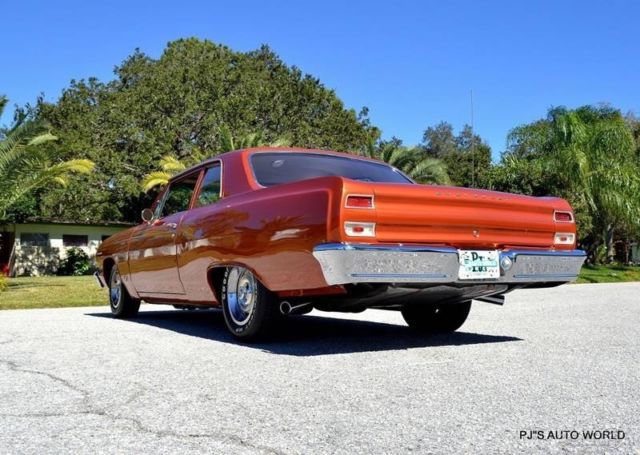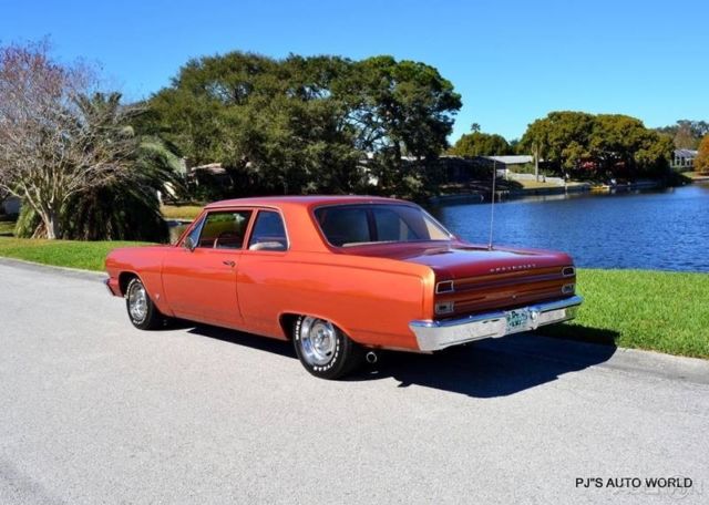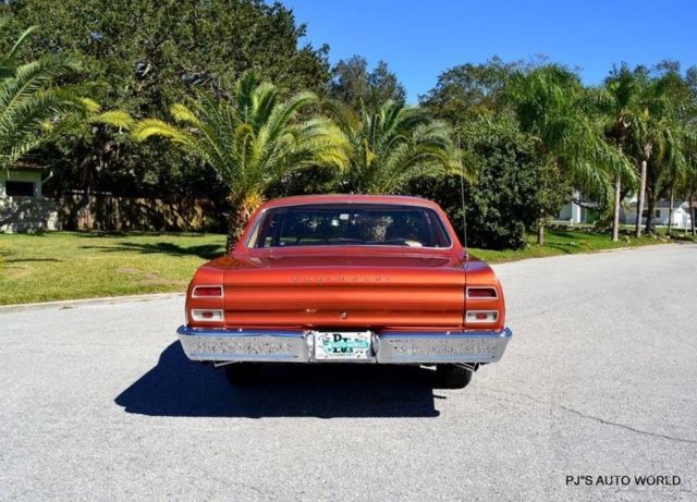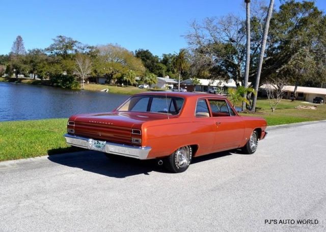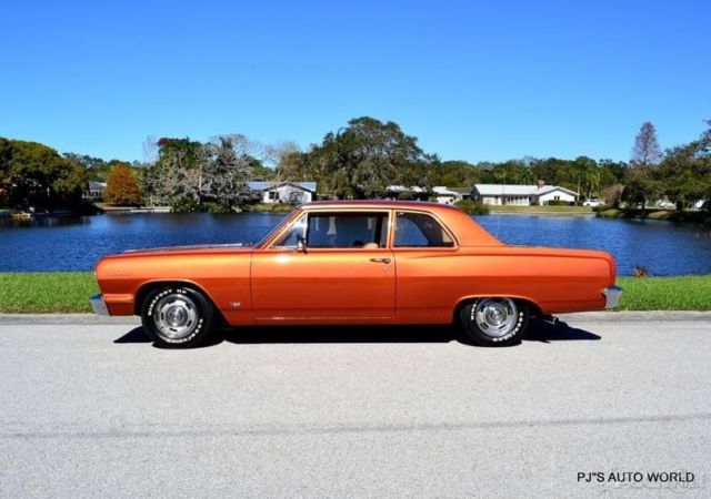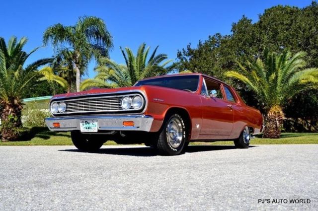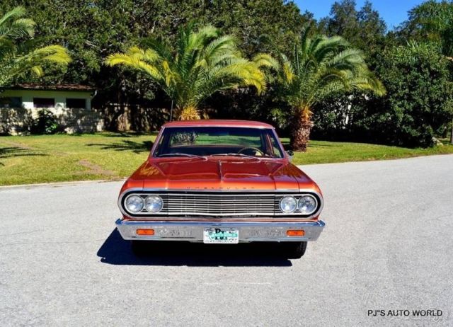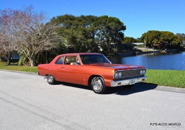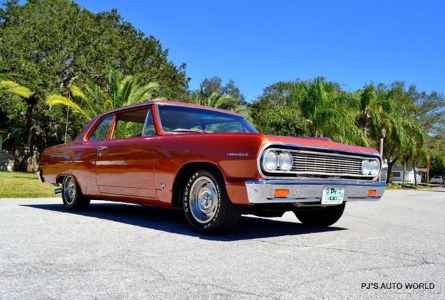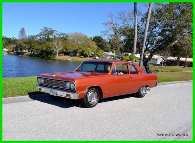 | 1964 Chevrolet Chevelle 300 Sedan for Sale. 350 Cubic Inch V8 engine, 4 speed manual transmission, Edelbrock 4 barrel carburetor, aluminum intake, headers, dual exhaust, power steering, power disc brakes, Sunset Copper exterior, driver's chrome sport mirror, custom two tone bucket seat interior, cup holder console, Hurst Shifter, Dolphin Gauges, wood handle steering wheel, Kenwood AM/FM/CD radio. Sharp Chevy! |