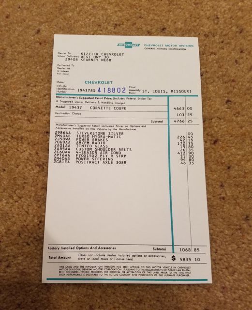 Up for sale is a beautiful matching numbers honest and true 1968 Corvette coupe: L30 327/300 HP. Nicely equipped with automatic, power steering,brakes, working R134 AC, custom shoulder belts only (350 installed). A rust free undercarriage, standard black interior, Silverstone silver exterior, motor rebuilt at 109500 miles the car has 121900 on it now, Hot tanked bored 30 over new valves, guides, springs, new pistons,rings, 350hp cam, high volume oil pump, new master cylinder at that time, repainted in 2003. In 2012, restored original radiator, replaced the complete power steering system, replaced main seal, oil pan seal, replaced restored leaf spring bushings, front control arm shaft, bushings, replaced left front and rear calipers, replaced out put shaft seal, serviced transmission and rear end. Restored original radio, replaced seat covers foam, door panels, and carpet. In 2014 replaced brakes light switch, tach cable, neutral switch, complete exhaust system aluminized 2 1/2 inch magnaflow mufflers, replaced right lower control arm bushings, idler arm, sway bar links, ball joint, rear storage compartment doors, inner door hardware (windows) sun visors, 2015 replaced gas tank, have partial tank sticker. In 2016 replaced Air conditioning compressor, I have the original numbers matching compressor, replaced vacuum actuator relay. In 2017 repainted the wheels installed a set of the brand new firestone FR 70 15 bias ply radial redline tires, replaced turn signal switch and valve cover gasket. All lights signal, fiber optics, wipers,interior lights exterior lights work as they should, motor, transmission rear end absolutely no issues, paint looks great for being 14yrs old and has a brilliant shine, perfect lines, a few minor scratches, this isn't a trailer queen, it's a car that is driven once or twice week, stored in a climate controlled garage from November through March, I will load a video as well you can contact via email or contact me at 402-301-6494. Thanks for looking.