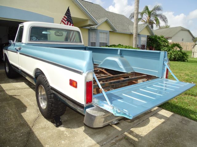 1969 LWB C10 2WD Fleetside. The GOOD:- No rust- paint is very good (could use a polish)- New weatherstripping- new battery- Runs and drives good- Interior is very good (couple of small tears in drivers side of seat- all gauges and lights work The Not so GOOD:- Needs brakes- AC needs repair- Needs wood bed- Grill and headlights should be brought back to stock (personal choice, I think currently its ugly)- needs a couple of side trim peices and badges, This is one of the nicer 67-72 C10's I have found in a while. It won't take too much more to make this a $20K+ Truck!! Body is clean and solid, cab floor is clean and solid, Finish the wood bed off however you want it. Its already stripped waiting for a new floor to be installed. Now is the time to convert the gas tank to the back before the wood floor goes in. These trucks just keep going up in value. Get this one while its still on the inexpensive side. The longer I have it, the more will get done and the more the selling price will be! I have over 60 pics on my laptop, contact me and I will send you a link. Can help with shipping arrangements CONUS |
