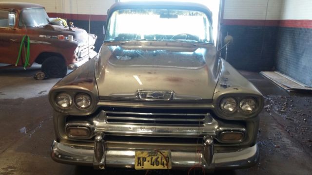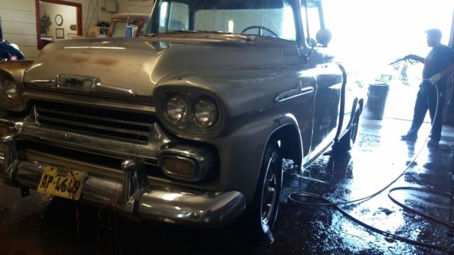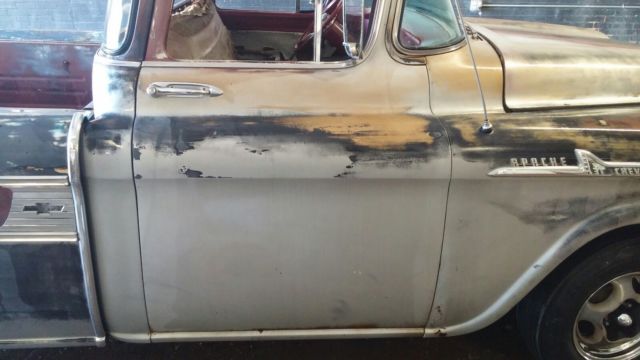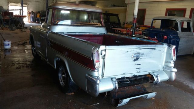 1958 Chevy Cameo Carrier barn find with great patina. This truck was parked in a dry Texas barn 40 years ago protecting it from the elements. It is a very straight solid truck. At some time in the past a big block and turbo 400 automatic transmission were transplanted into it.(condition of motor and trans are unknown) This truck is very complete and a perfect candidate for a high end restoration, or just clear it and have an awesome patina truck. The truck does not run or drive, but rolls and steers fine. Starting in the front the bumper, grille, bumper guards, headlights and headlight trim are in great shape. The hood is very straight and solid, however it does possess the biggest dent on the truck which is very minor under the hood emblem (see Pic). The left fender is very solid and straight, the right fender is straight but has some rust starting to blister in the lower portion (see pic). Cab is very solid and straight, perfect around all glass pinchwelds, front cab corners are solid inner and outer, Steps are very solid although the do have somerust pitting, but no holes. Floor is solid no holes at all but does have some pitting on the passenger side(see pics). Rear inner cab corners are solid, outer rear left cab corner has rust between cab and be, needs about a 3-4 inch patch, and the right outer cab corner has some blistering between cab and bed (see pics). Doors have very solid hinge pockets and outer skins but the bottoms of both inner doors need minor patch work around lower weatherstrip area(see pics). Windshield has a crack and vent windows have bubbles in glass the door glasses and rear window are good. All cab stainless can be repaired and polished. roof is straight and solid. The frame is solid on the truck but has been modified to accept the big block and trans. Retains all stock suspension but has adapters to 5 lug. left front shock is missing. Driveshaft is there but wired up to frame to roll around easily. Now for the important stuff Cameo bed parts. The fiberglass bedsides and tailgate cap are very solid no chunks missing and thefew cracks I can find are very minor only where the brackets bolt to the lower lip. The top potmetal rails that cover the bedside bolts are missing, but available aftermarket. All other potmetal trim is there and in above average condition, but will need chrome plating redone to be show quality. The rear bumper ends are solid just need chrome plating. The bumperettes are solid and bolts are not seized but have some dings, a good chrome shop should be able to straighten them. the bumper ends are solid and straight. the center fold down section is not frozen, works great and is solid and straight. the rear bumper need to be aligned. The taillights and bumperettes will be shipped inside the truck they are mocked up for pics only, and not securely attached. The tailgate opens great and the original retractors still function properly. It has a auto tilt and telescoping steering column. original radio speaker and deluxe heater. NO KEY, SOLD WITH TEXAS BONDED TITLE. TITLE WILL BE DELAYED ABOUT 6 WEEKS FOR PROCESSING. This is a very honest and accurate description of the vehicle. Feel free to come inspect or send an inspector. Some pics were taken with the truck wet so you can see how straight the panels are, it does not shine. This is a great start to a very rare and collectable truck. More pics available upon request for serious buyers.