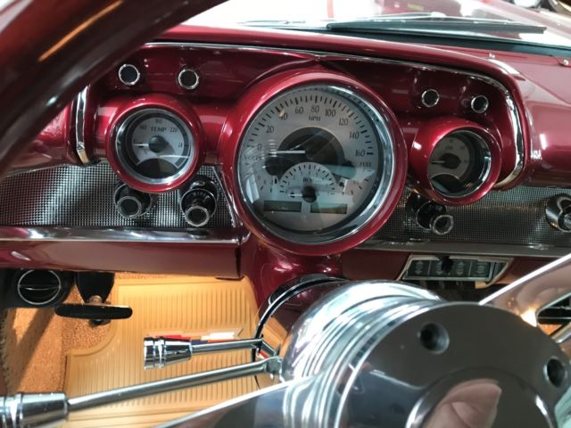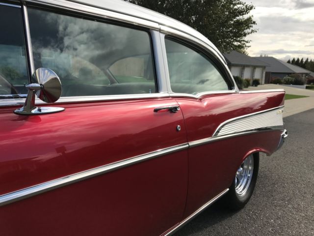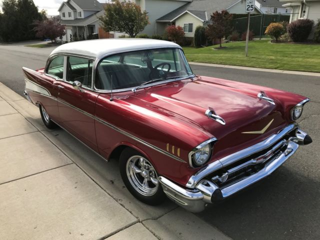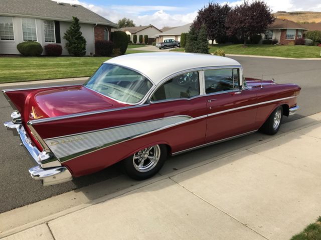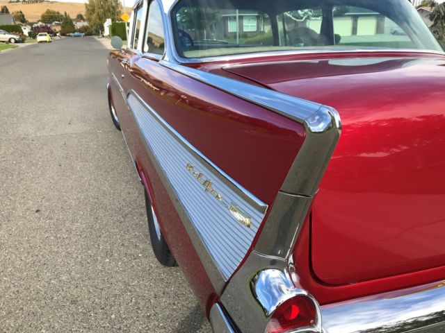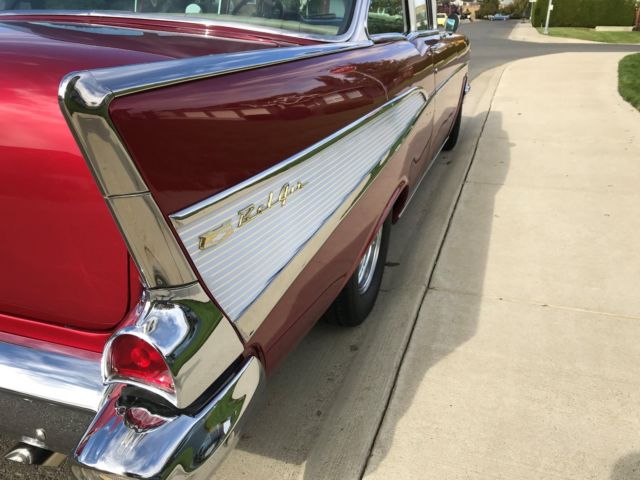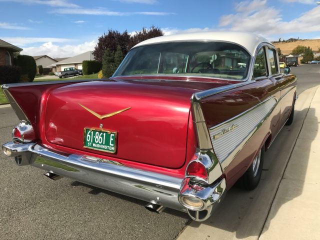 This gorgeous 1957 Chevrolet BelAir 2-door Sedan was built from the ground up with the idea of creating the "perfect" compromise between a factory original 1957 model car, with the conveniences, drive ability, and reliability of a newer car. That idea was achieved perfectly in this vehicle, and it has to be one of the finest of its type in existence. This beauty was built from a very original, solid, complete, and dry local vehicle, adhering to a plan that was developed, supervised and/or actually executed by a very meticulous hobbyist/craftsman (who happens to be the current seller since the car was actually built for his own use and enjoyment). The attention to detail and perfection in this car is absolutely stunning! The restoration work began with a complete disassembly of the vehicle and inspection of ALL original parts. The body was removed from the frame and mounted on a rotisserie for a thorough and complete restoration/refinish/replacement of every part on the car as required to insure that no detail, however small, was overlooked. It would be impossible to include all of the details of the restoration in this paragraph, so the highlights are listed on the bullet chart below. Suffice it to say that this car is a knock out from any perspective, be it the underside, the interior, the body and paint, the trunk, the engine compartment and any other area, as shown in the photos in this listing. Engine: GM 350 cu in ZZ4, 355 HP, 405 Ft-Lbs Torque (Turnkey crate engine). Transmission: Professionally rebuilt 700R4 automatic with floor mounted Lokar shifter. Frame factory boxed and powder coated. Axle housing powder coated. All suspension pieces powder coated, including inner fender wells, front support bar, and bumper brackets. Underside of body color coated same as exterior of the car. Ididit tilt steering column and Grant Custom steering wheel. Dakota digital/analog instrument cluster. Lokar throttle and pedal assy. Doors (inside), floor, and under dash fully lined with Dynamate. Vintage heat and air conditioning. Aluminum radiator. Raingear 2-speed wiper system. 2" dropped spindles with CPP Tubular upper A-Arms. CPP series 500 power steering box. Four wheel CPP disc brakes with drilled and slotted rotors. New brake and fuel lines front to back. Eaton posi-trac rear end. BFG Radial TA tires (P225/60R15 front, P245/60R15 rear) mounted on American Racing Torque Thrust Aluminum wheels. Original Bel Air stainless steel molding reconditioned and polished. All NEW glass with vent-window mechanisms totally reconditioned and sealed. New door and trunk rubber seals. Car completely rewired front to back. Sanderson ceramic coated headers. 2 1/2" stainless steel exhaust with Flowmaster mufflers. Custom pleated upholstery on original seats. Car painted with top coat/base coat PPG Red Flame Pearl with White Pearl top. Inside of doors completely painted as well. New gas tank and lines. Original one-piece front bumper re-chromed. New front grille, hood bar, and bumper extension.