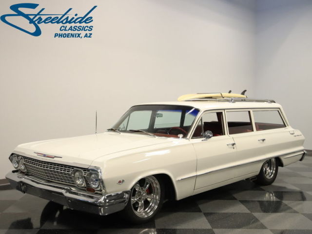This is the unassuming nice guy that's got the ability to beat everyone up. On the outside it looks like a nice pristine 1963 Chevrolet Bel Air wagon dressed in a dignified white. What you don't see is the performance crate motor and Corvette fully-independent suspension. So this is the three-row wagon that can haul far more than just the family. Bel Air wagons from this era are already highly collectable because the wide chrome grille up front and the full-length trim are both icons of the 60s. In fact, the brightwork is so important that it was all removed during restoration, de-anodized, polished, and carefully re-installed. And what helps make it all stand out even more is the paint. Ermine White is a great color that was even shared with the Corvette something to keep in mind as you read the other details of this custom build. The final piece to catch the eye-catching package is a set of large 17-inch American Racing Torq Thrust wheels. After all, don't you just love how they tuck under the rear fenders and contribute to the aggressive stance? When it comes time to carry all of your family and friends, do it in style with this fresh red interior. The cloth and vinyl benches have everything in place, right down to the buttons stitched into the seatbacks. This very correct presentation is courtesy of the investment in new Ciadella seat covers. And yes, you do see that this one has the third-row seat option. That's a great piece we wish we could still get in wagons today, because after all, any noisy kid is facing the other direction. But the seat that really matters the most is the driver's seat. That's where you're in control of everything from the AM/FM/CD stereo, to the upgraded sports steering wheel. And as you see the large column-mounted tach and the matching auxiliary gauge trio to the side, these tell your senses there's something special under the hood even before you twist the key and hear the side pipes roar. The engine bay looks far more modern than anything that came out of the '60s... and there's a good reason why. You're looking at a new 350 cubic-inch crate V8. More than just a fresh performance motor, this has modern fuel injection. And if you think this V8 looks like it belongs in a C4 Corvette, then you're going to love the fully-independent sports suspension that was borrowed from one, too. So yes, this is the classic grocery-getter that has the modern moves to literally run circles around other classics. But more than just performance, this very custom Bel Air is an all-around great driver. That's why you have power steering, four-wheel disc brakes, and the grip of modern Goodyear Eagle RS tires. Plus, the 700R4 four-speed automatic transmission was rebuilt less than 1,000 miles ago, so feel free to enjoy overdrive cruising near or far. This is the cool kind of custom build that you can share with the family, or just enjoy the full restomod performance all by yourself. And with such an obtainable price, what's stopping you from doing it all? Call today!!!