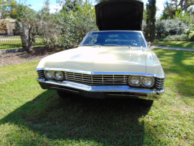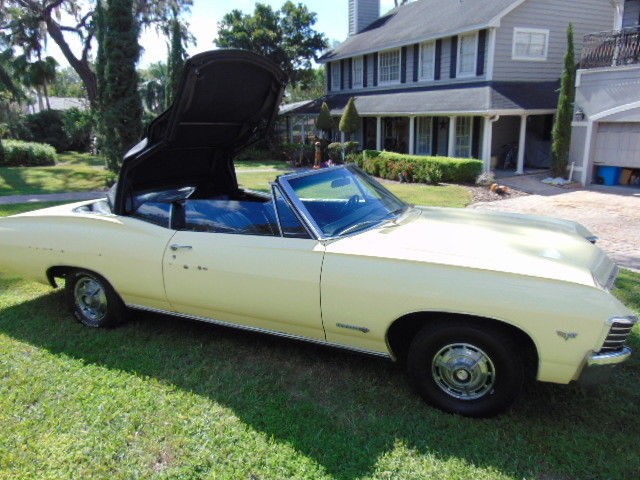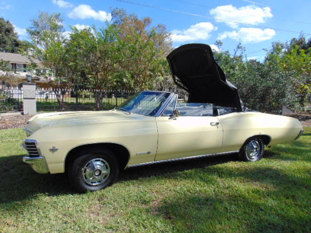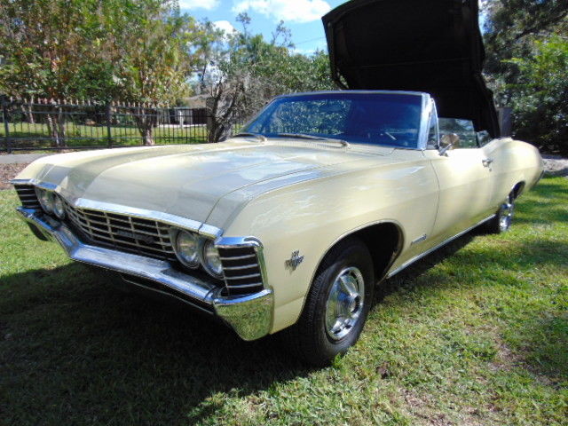 1967 CHEVY IMPALA SS CONVERTIBLE,FACTORY SS CAR, WITH THE ORIGINAL 327/275 hpOPTIONAL ENGINE, RARE FACTORY A/C, POWEER STEERING AND POWER BRAKES,THE CAR CAME OUT OF AN ESTATE AND WAS OWNED BY ONE FAMILY ALL OF ITS LIFE,EVERYTHING WORKS ON THE CAR INCLUDING THE POWER CONVERTIBLE TOP, IT HAS BEEN IN STORAGE FOR A NUMBER OF YEARS, OIL WAS CHANGED, FRESH GA, AND SHE FIRED RIGHT U, ENGINE RUNS LIKE A SWISS CLOCK, NO OIL LEAKS,AND SHE DRIVES GOOD, ALL GLASS IS GOOD AND ALL WINDOWS WIND UP AND DOWN FINE,THERE WAS SOME SURFACE RUST BUBBLES IN THE PAINT WHICH WERE SANDED DOWN,THE CAR NEEDS TO BE PAINTED, OR JUST DRIVE IT AS IS, ALL PANELS ARE ORIGINAL TO THE CAR, INTERIOR IS IN GOOD CONDITION, DRIVERS SEAT HAS A SPLIT IN THE SIDE, AND REAR SEAT BACK HAS A COUPLE OF SPLITS BUT THE NEW SEAT COVERS COME WITH THE CAR AND ARE IN THE TRUNK, FRONT BUMPER HAS A DING ON PASSENGER SIDE, UNDERNEATH THE CAR IS RUST FREE AND THE TRUNK IS ABSOLUTELY SOLIDYOU DONT FIND TOO MANY SURVIVORS LIKE THIS,CAN SEND A VIDEO OF ENGINE RUNNING, CAR IS SOLD AS ISTHANKS FOR LOOKING,1-407-217-6012