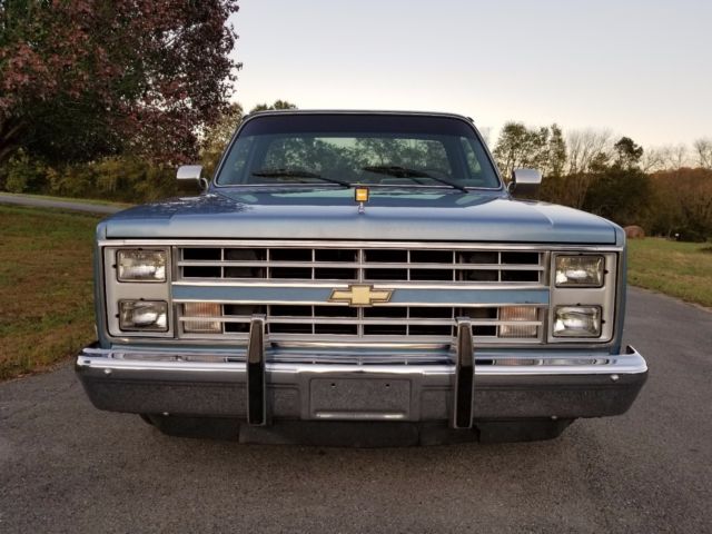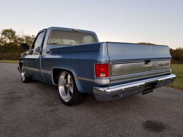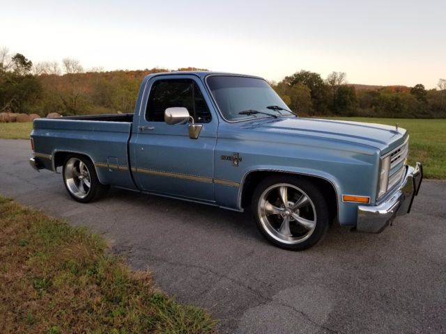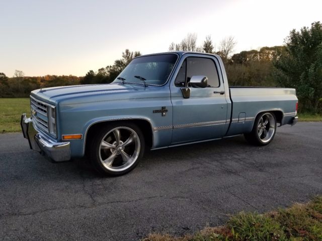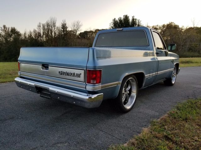 This is a 1986 Chevrolet C10 Silverado. I bought it from a 70+ year old man located in Tennessee. It was stock as a rock and he had owned it for 15+ years. It was originally an Alabama truck. It still had the original paint, original seat cover, etc. The only thing he said he did to it was replaced one of the fuel tanks and a fuel pump. I Brought it home and started taking it apart to paint. It got new paint, chrome, upholstery, rubber floor mat, bedliner, tint, badges, Mcgaughys 4/6 lowering kit, 20" Ridler Staggered Wheels & Tires, Wash & wax. It's a factory 305 5.0 V8. Would be a great cruiser, runs good shifts good, looks good. No leaks, no known problems. I did not shine up the engine bay, this is the way it was when i got it and i dont like soaking the motor with water. It has a few dings here and there. Its not a perfect truck but like i say it would be a great driver.