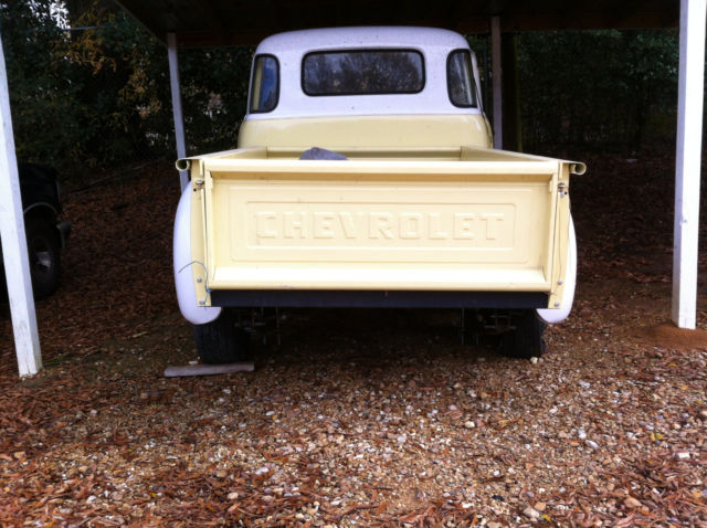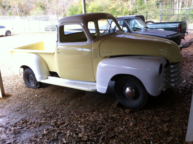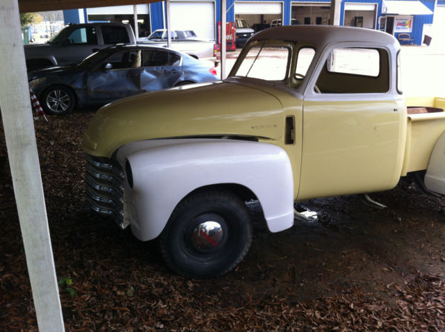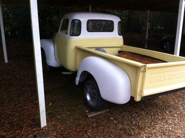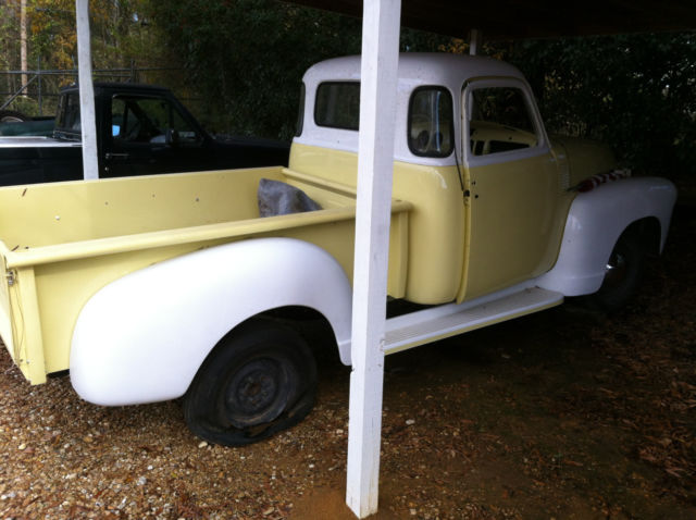 1951 CHEV 5 WINDOW PROJECT, HAS ALL NEW SHEET METAL, FRAME IS SANDED AND PAINTED, TRUCK IS PAINTED A UGLY YELLOW AND WHITE, GOOD PAINT AND COULD BE BUFFED OUT TO LOOK REAL GOOD, IM IN THE PROCESS OF BUILDING 3 TRUCK'S THIS ONE NEED'S TO GO. TRUCK APPEARS TO HAVE GMC FENDERS AND THE HOOD IS NOT THE CORRECT HOOD, I DO HAVE TWO HOODS TO GO WITH IT, BED IS ALL NEW EXCEPT NO WOOD. On Dec-21-17 at 08:19:52 PST, seller added the following information:The truck has a new engine and a rebuilt 3 speed transmission, there are some parts missing from the motor and interior part's also the new grille doe's not go with it, I do have a uswed one that will, there are some extra part's inside such as a new seat cover, ws rubber, headlight trim, mouldings etc.