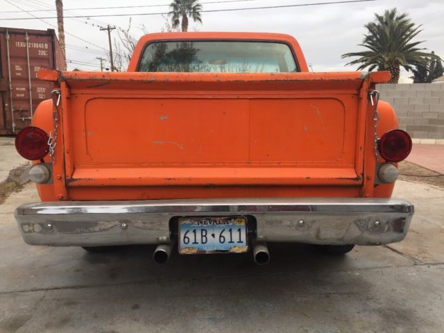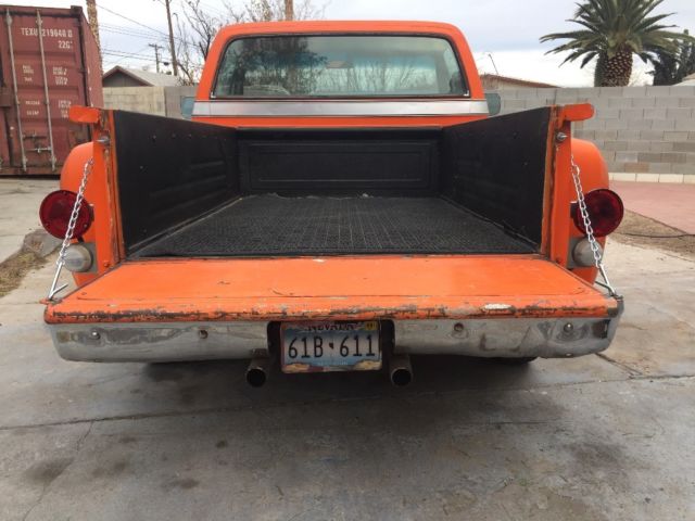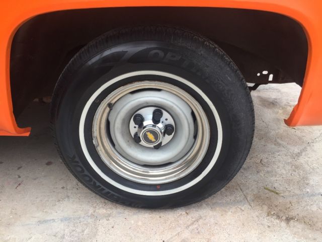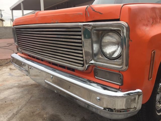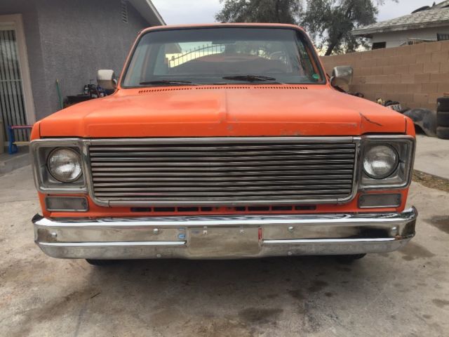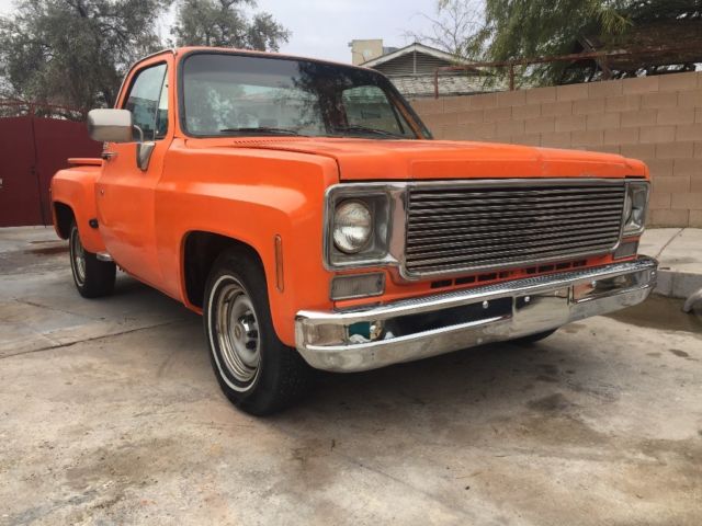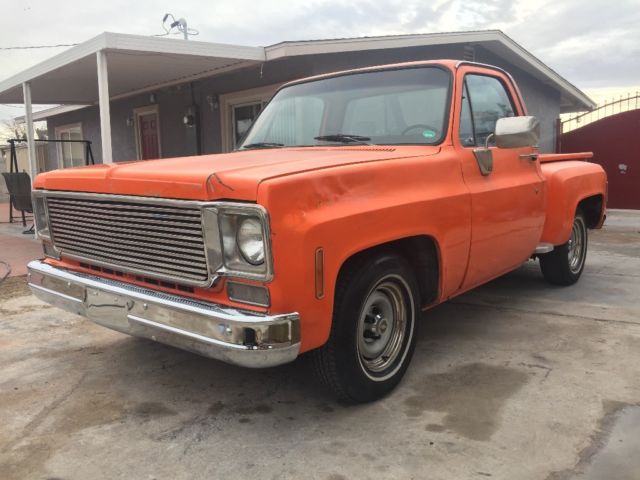 | Up for bidding is a 1976 Chevy c10 stepside short bed truck. This is a NO RESERVE auction. So please only bid to win. If you have less than ten ratings. Do not bid on the truck. This is a rust free Nevada truck (chipped paint has surface rust ) that has never seen snow or salt. The motor is a Chevy small block with automatic transmission. This truck has dual exhaust and CD player and a few more tasteful upgrades such as Hedman hedders and aftermarket carb. I will be including a bunch of extra parts that I have saved for this vehicle. It's a fairly complete truck . Has factory GM wheels with nice set of white wall tires. Has brand new carpet along with a nicely upholstered seat that's very comfortable. Brand new taillights, and fresh bumper. Truck is located in Las Vegas, Nevada. Feel free to come inspect it and check it out. The truck is 40 plus years old so do expect dings and dents here and there and typical wear. The driver side window needs new guides and window regulator. Was painted sometime ago so the paint is showing age and door has body filler. Bed wood is old and should be replaced at some point and the parking switch is not working (cheap fix) . If trucks parked for a few days I spray starter fluid but starts right up. Other than that she is a great looking ride that gets a lot of smiles It's a great ride for anyone.Truck is being sold as is. Non refundable deposit due at end of auction. | Mileage can't be determined to be accurate due to age and the fact that the odometer doesn't go passed 99k.