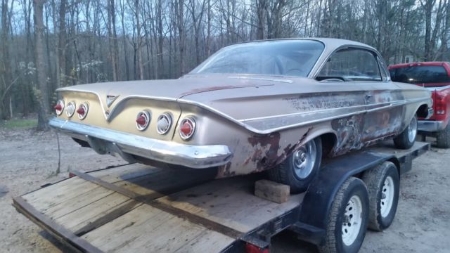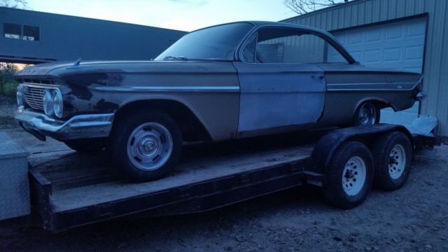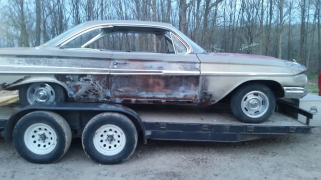 1961 Impala ( Bubbletop) Great builder. !!! Someones Dream come true !!!!Car is 95% complete with original drivetrain., 283, Powerglide, car does NOT run, engine will turn over and is not locked up. St Louis Plant. See cowl tag pic's and vin.Needs typical rust repair required, better condition than most Missouri cars this vintage. Rear floor pans need replaced, front pans usable in my opinion. All glass in car, windows goes up and down however some glass is bubbled and windshield has crack, rolls and steers, will help load. Had been sitting on blocks for 20 years, leaf fire gave it a little extra patina on right side..stored in enclosed trailer now. 14" Rallies included with good tires Frame looks good. Feel free ask questions Shipping is your responsibility, I can hold the car within reason if prior arrangements made with me and deposit.. Check my feedback, Call for more details.Chris 417 260-1698