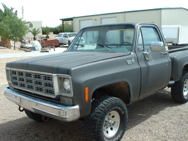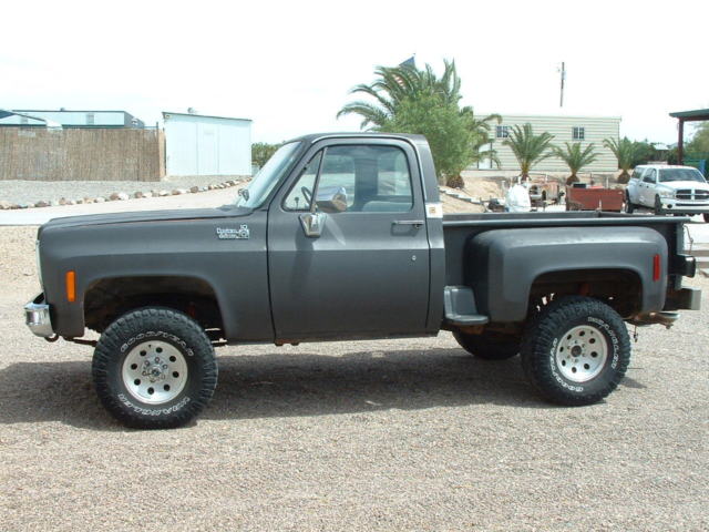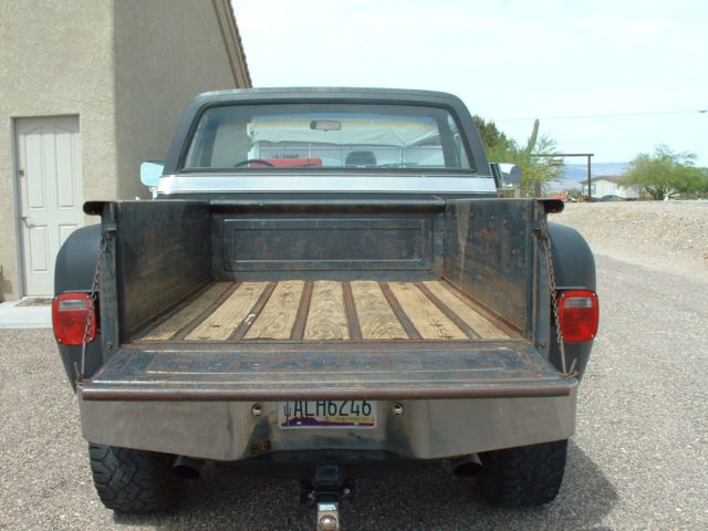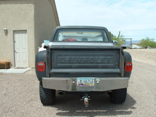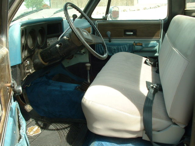 I purchased this truck in 1977 with 7000 miles and now it has 99K miles. I replaced the engine with a 350 long block and rebuilt the transmission in 1997. I had a shift kit installed with the transmission rebuild. Front hubs have lockouts. This engine has around 8000 miles on it. It comes with a performer intake and an Edelbrock carburetor. Dual exhaust front to back. It has power steering, power brakes, tilt steering wheel. The wood in the bed is original and in very good condition. Has been garaged for half its life. Comes with 2 sets of tires and wheels but the tires need replaced. All glass in good condition. The dash has a few splits but not bad for the age. New carpet and the seat has been reupholstered. There is a dent in the right front fender and I had the truck repainted in 1982 so the paint is old and has the patina look. The right rear fender has some bondo that is cracked from brushing into a tree years ago but I have a newer set of rear fenders that go with it. There is some rust on the front cab supports that can be easily repaired. Truck starts good, has plenty of power and I installed a new battery. I have tried to describe the truck the best I can. If you need more photos or have any questions please send me a message or call me at 7852215372. I did look today and the truck does say 104K miles on it. The truck does have a 3" Lift. I had the springs taken off and re-arched, I didn't use shackles. It was done the right way. I also installed new drive shafts when I put the new engine in. All gauges do work. All wiring is in good shape.