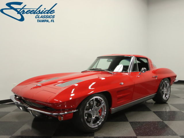 Think you've already seen the best restomods around? Thank again. This 1963 Chevrolet Corvette is a pro-touring machine that keeps the iconic C2 silhouette, but it has the modern LT4 engine. Plus, take the time to look over the custom frame, paint, and interior. Once you realize how amazing this full custom build is, make room in your trophy case. Even from just a quick glance everyone will know this Sting Ray is special. The red paint takes advantage of the most modern clearcoat practices so you get a deep shine that you'll swear it was dipped in candy. The '63 was the perfect starting point for this project. It's the first year for the legendary C2 Sting Ray, and so everyone knows it's the one and only year for the sought-after split rear window. Plus, this is the one is for the lovers of brightwork. After all, not only do you get the artful bumper that makes the C2 so iconic, but also you get the big, bright hood screens. Plus, when you have invested so heavily over every inch, and there is less than 6k miles on the whole build, you better believe everything shines bright enough for ladies to check their makeup against your chrome. And while you can tell this one is a cut above classic by its laser-straight body lines, the late model Corvette polished alloys also clue everyone on all the custom upgrades beneath the skin. Just like the exterior, the interior is unmistakably based on a C2, with a ton invested in giving it modern attractiveness. For example, the iconic dual cowl dash has the level of crispness that feels like you're buying this from Chevy in '63. And while all the gauges are in the correct place, you'll notice plenty of upgrades. As expected from a full custom build, it comes loaded with features such as air conditioning, power windows, power steering, a modern AM/FM stereo with digital tuner, and a 700R4 four-speed automatic transmission w/overdrive. When you slip behind the three-spoke leather and chrome steering wheel, you'll notice the full AutoMeter gauge package that instantly lets you know there's something special under the hood even before you twist the key and hear it roar. Any thoughts that this Corvette is running something close to stock are completely blown away the moment you pop the hood. Everything you see is either painted to coordinate with the exterior or polished to a mirror-like shine. And the amount invested to keep the custom installation looking this tidy can win awards all on its own. But more than just style, as a true pro-touring machine, there is substance behind the shine with the LT4 fuel-injected V8. While you'll love this modern power, its upgraded support components also mean you can even idle in traffic without worrying. But this car is much more than great paint and a dynamite motor. Look at the undercarriage pictures where you can see the full custom tubular frame. This also means an upgraded A-arm suspension in front, and the rear is an upgraded independent setup based on a C5 Corvette. Plus, each wheel has coilovers, disc brakes, and the grip of modern ZR rated-tires. So you better believe this award-worthy build is also ready to attack the backroads. There is just so much custom work put into this wicked pro-touring creation that we don't have the space to list it all here. So give us a call for all the info. Plus, we'll even share details like the owner's manual and the full photos file on this so you can take others on this iconic split-window's full transformation. Don't miss out at the unique opportunity at an iconic American that handles like a modern sports car. Call today!!!