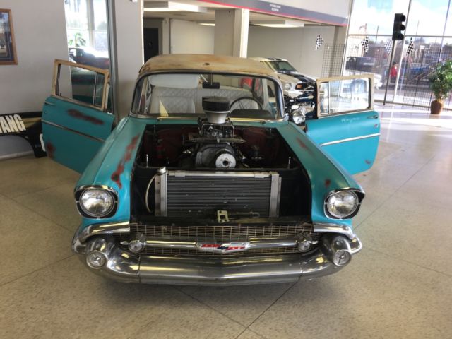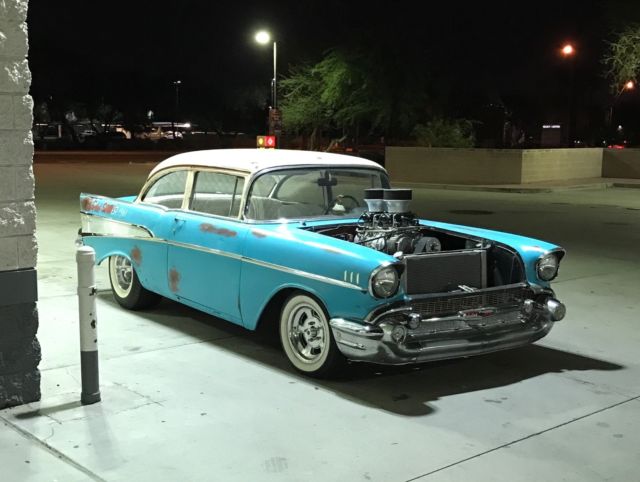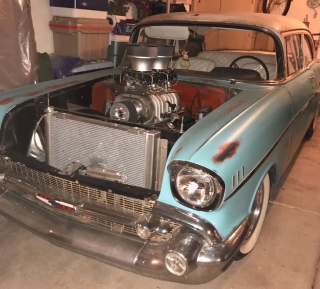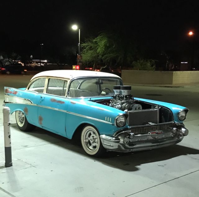Old School Auto Repair 33 S. Alma school Road, Mesa, AZ 85210 480.964.2398 contact.oldschool@yahoo.com 1957 CHEVROLET BEL AIR CUSTOM Patina paint treatment Hot Rod Style BEAST 454 Big Block Engine 871 TBS Blower Blower Shop and the Heads are Brodix Brodix Heads Turbo 400 Trans Wilwood Disk Brakes Front and Back Wilwood Master Cylinder After Market Analog in Dash Gauges Ididit tilt Steering column Coker Classic Tires Front and Rear Halibrand Rims 15x5 up front 15x10 in the rear Sanderson Headers with full 3 inch exhaust Ford 9 inch rear end with ladder bars Beautiful white interior in great condition Tub treatment to rear fenders Inspection done by Mark Jr at Old School Auto Repair |