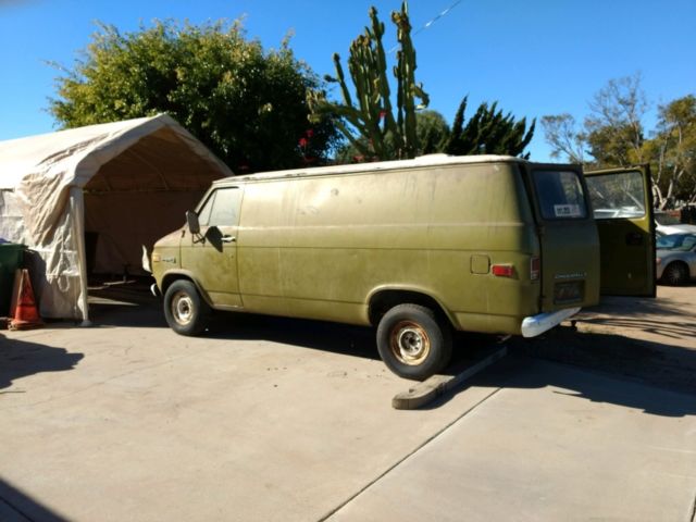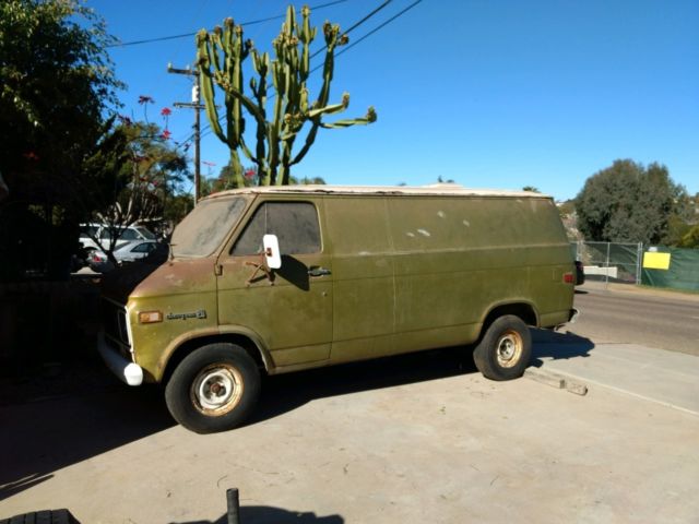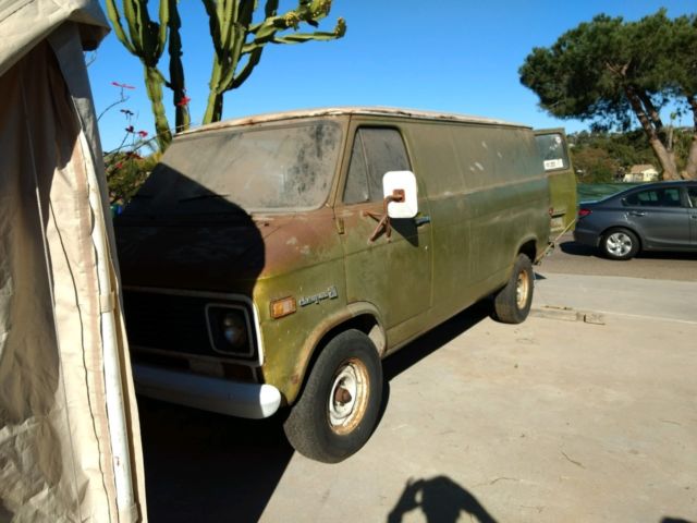 | This is a one owner car and I am the original owner. The van is a 3/4 ton long bed with a 350 motor and automatic trans. Every thing is original. The engine has never been out of the car. The car is a project and needs a lot of work. The last time the car was licensed or running was about 2003. It has been sitting for over 15 years. It would be great to just cut the top off of it. The car runs but needs adjustments. The trans is leaking fluid but I have not run it The van has never been hit. |