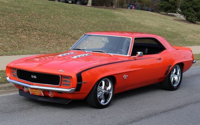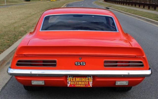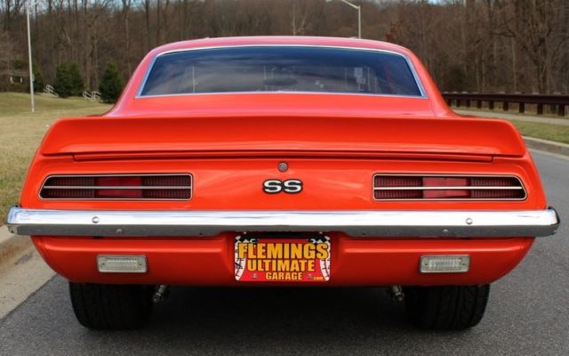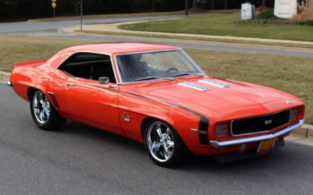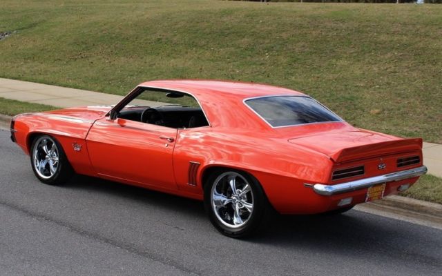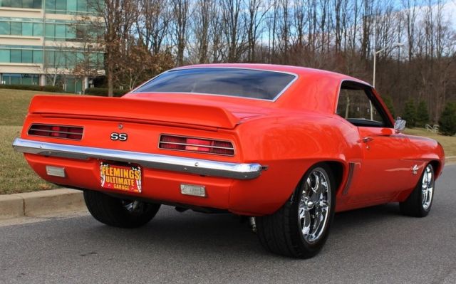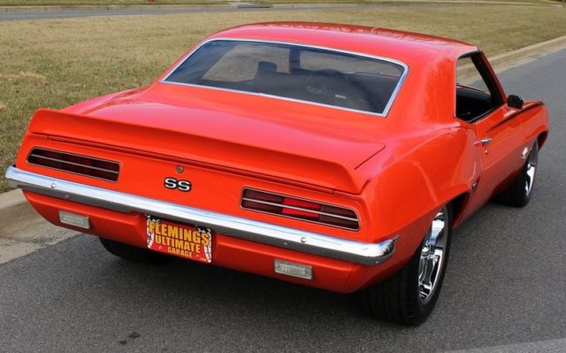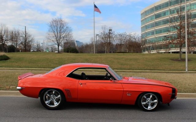 • Spectacular, $125K no-expense-spared, professional build with modern performance and luxury upgrades with only 555 miles!!! • Chevrolet Fuel Injected Aluminum LS1 V-8 • Upgraded Cold Air Intake • High-Capacity Radiator with dual electric fans • Tremec T-56 6-speed manual transmission with Hurst Shifter • Heavy Duty, 12-Bolt Rear Differential • Mirror Finish, Correct "72" Code Hugger Orange paint with Black SS Stripes show waxed & detailed • Iconic RS Front End and Rear End • Front Chin and Rear... Spoilers • New Deluxe Black Bucket seat interior with full custom console and cup holders • Custom Dash with Dakota Digital Gauges including 8K RPM Tach, 160MPH Speedo + Console Gauges • Optional Woodgrain Interior Console Trim • Billet SS 3-spoke steering wheel with tilt column • Ice-Cold Air-Conditioning and Modern Heat from "Vintage Air" systems • Retro sound AM/FM/AUX/SAT Stereo + Premium Speakers • All New Door Panels, Headliner & Carpets • Great looking Chrome & Stainless Trim • Billet Window Cranks • Show ready detailed engine compartment • Detailed Trunk with custom mat • 4-wheel Power Disc Brakes with Cross-drilled & Slotted Rotors + Bear Front Calipers • Fast-Ratio, Rack & Pinion, Power Steering • Staggered 17" & 18" Ridler Chrome 5-spoke wheels with High-Speed Nitto Radials • Great Sounding Header Back Exhaust System • LS1 V8 Power plant, 6-speed manual, Correct "72" Code Hugger Orange and a New Interior too! • This is how you buy a 69 LS1 Pro-Touring Camaro, save a ton of money and not wait 3 years to drive it.